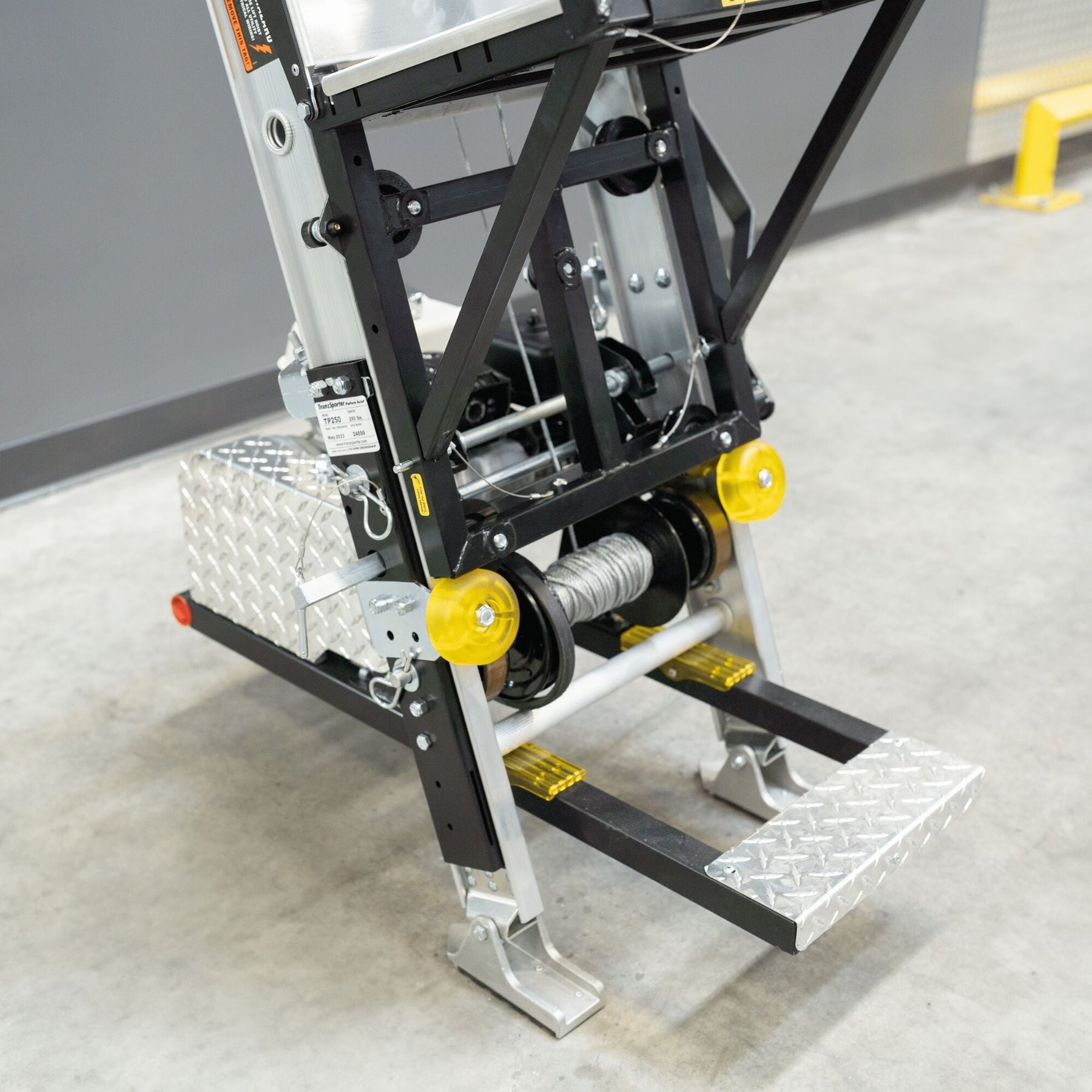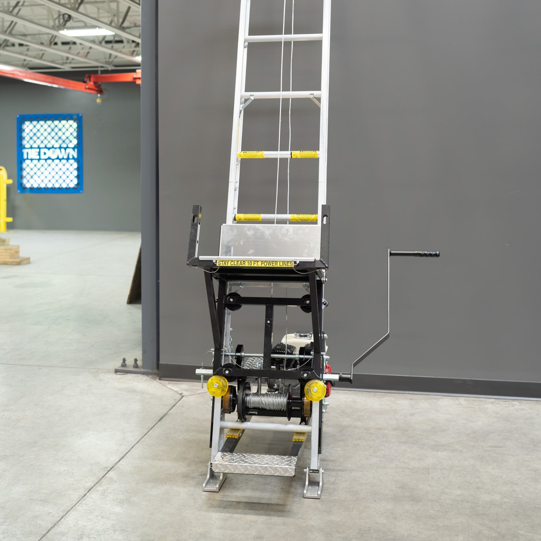 The Tie Down TranzPorter TP400 is a gas-powered ladder hoist that lifts up to 400 lbs of shingles and roofing materials to heights of 28 ft, expandable to 44 ft with optional track sections. Built with a collapsible aluminum carriage and foot-pedal/handle brake controls, it delivers durable, safer material transport for roofing jobs.