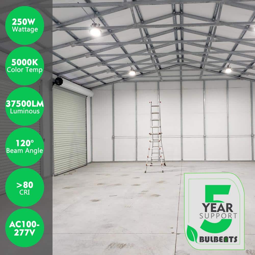 Illuminate large spaces efficiently with bulbeats 250W LED High Bay Lights. These lights offer 37,500 lumens of brightness, ideal for commercial applications like warehouses and workshops, with energy savings of up to 85%. Built with durable aluminum housing, they ensure extensive heat dissipation for long-lasting performance.