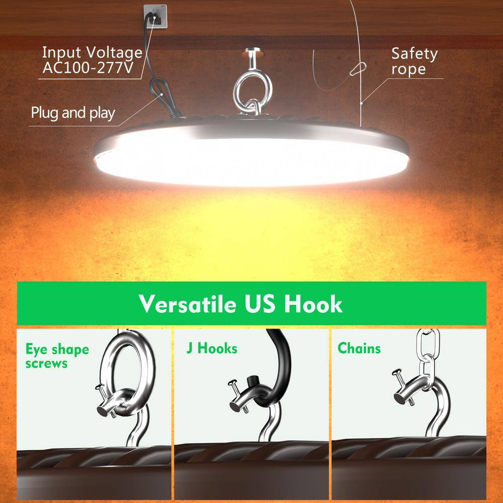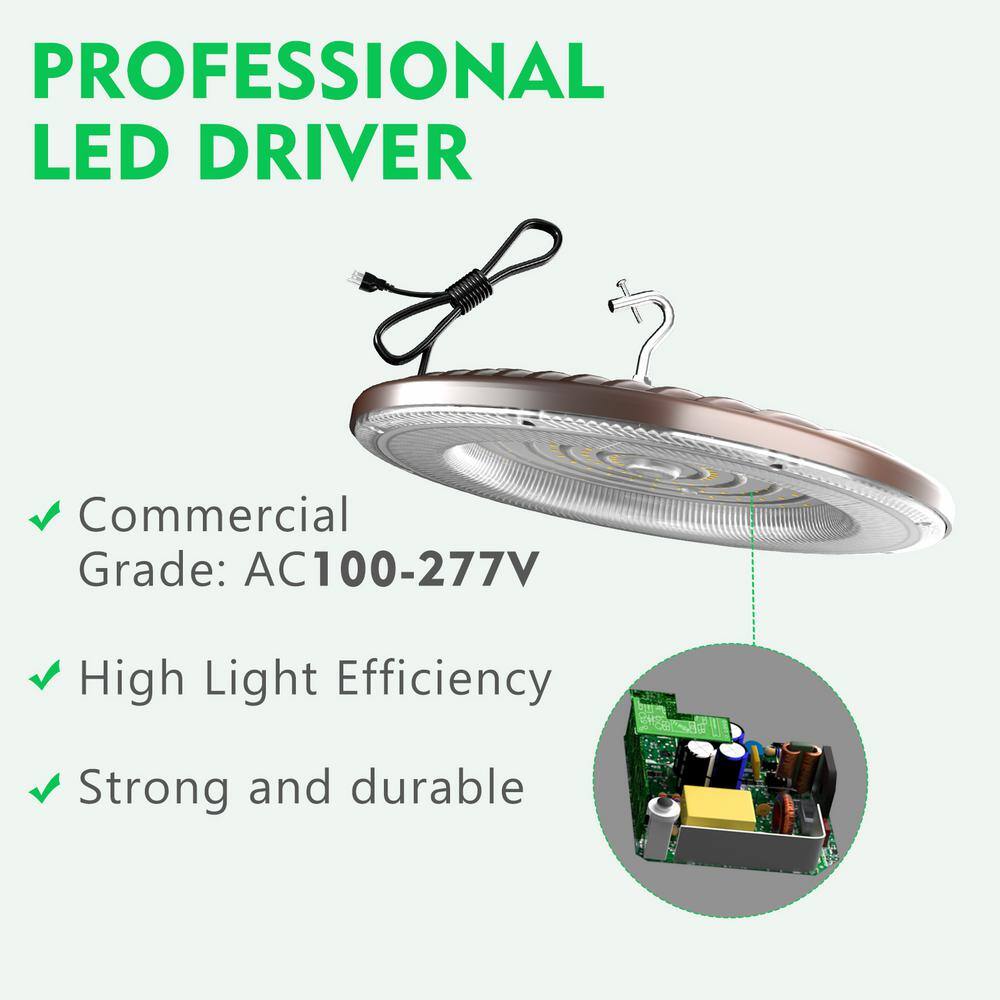 Revel in the extraordinary metamorphosis that unfolds under the glow of these LED wonders. With their striking UFO silhouette, these high bay lights add a futuristic charm while delivering unparalleled brightness to any space. Whether gracing the rafters of a cutting-edge workshop or presiding over a bustling warehouse, their sleek design effortlessly blends with industrial decor. Elevate your environment with this essential, illuminating masterpiece, the epitome of functional elegance.