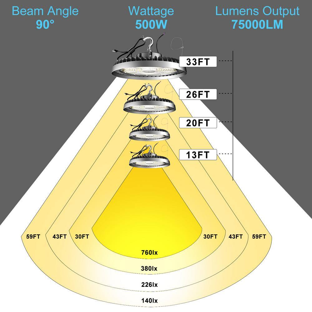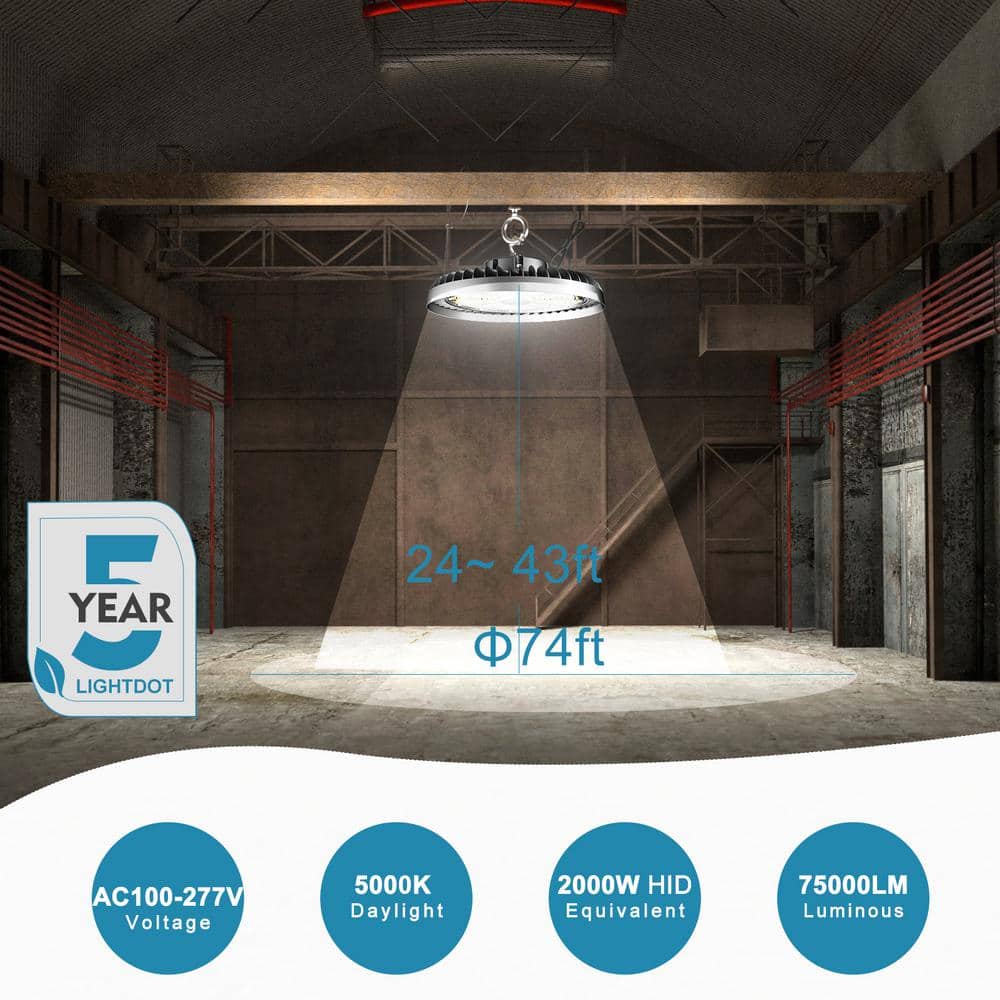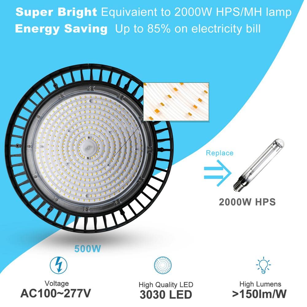 Illuminate your warehouse or workshop with the bulbeats 500-Watt High Bay LED Light, boasting an impressive 75,000 lumens output. Designed with durable aluminum housing for optimal heat dissipation, this efficient lighting solution saves up to 85% on your electricity bill. Perfect for commercial spaces, the fixture is easy to install with its included US hook and safety wire.