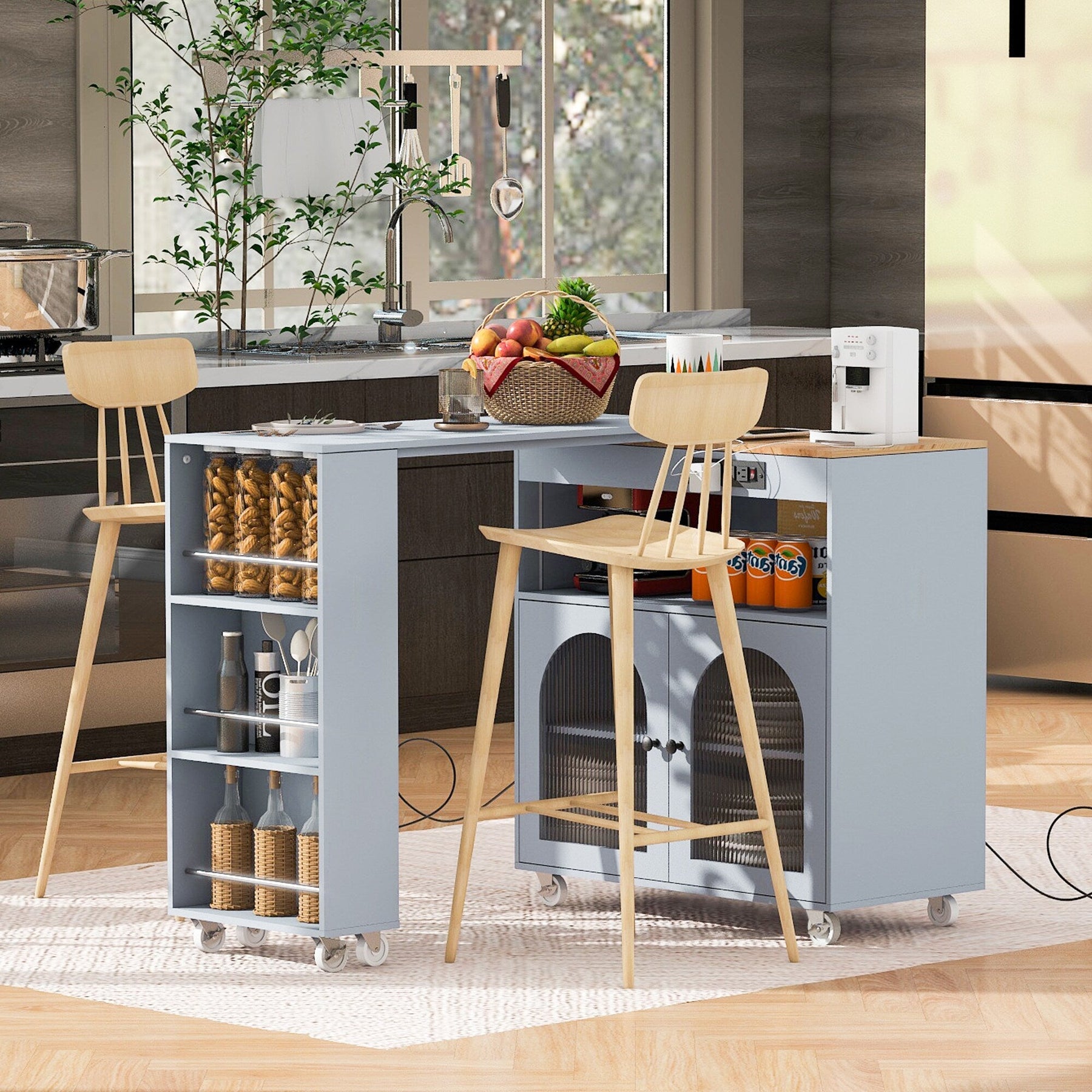 Transform your kitchen with the Bybafun Gray MDF Rolling Kitchen Island. This contemporary piece features a customizable layout, exquisite fluted glass doors with LED lighting, and practical USB ports and outlets, providing both functionality and elegance.