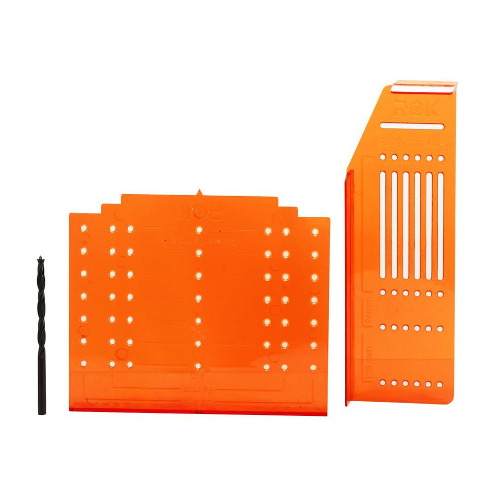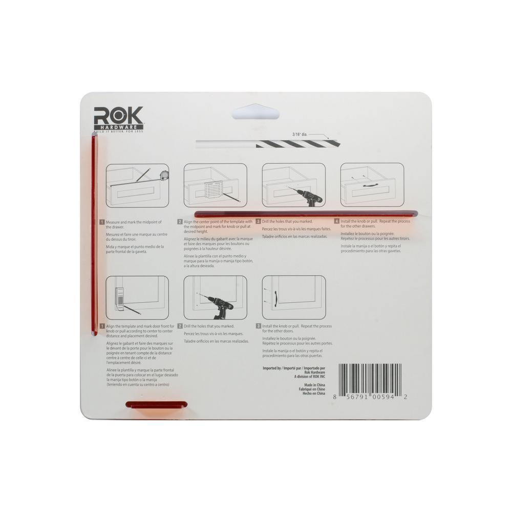 The Rok Hardware Cabinet Door and Drawer Alignment Template makes installing cabinet hardware, such as knobs and handles, simplified! Used for drilling holes with precision for accurate placement, making installation easy. Align 96 mm to 128 mm Cabinet door use: 1 - Align the template and mark door front for knob or pull according to center to center distance and placement desired. 2 - Drill the holes that you marked. 3 - Install the knob or pull. Repeat the process for the other doors. Drawers use: 1 - Measure and mark the midpoint of the drawer. 2 - Align the center point of the template with the midpoint and mark for knob or pull at desired height. 3 - Drill the holes you marked. 4 - Install the knob or pull. Repeat the process for other drawers. Kit includes: - (1) Knob Drilling Template - (1) Pull Drilling Template - (1) 3/16 in. Drill bit.