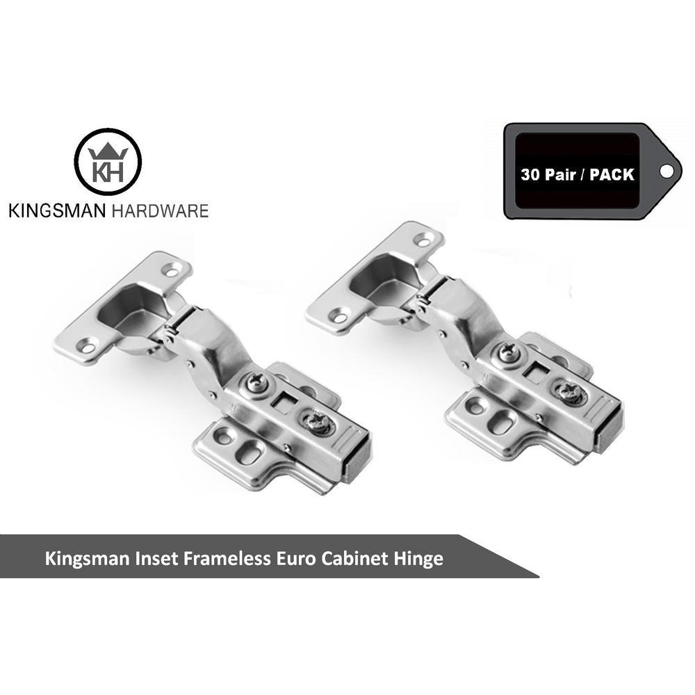 Discover the Kingsman Inset European Cabinet Concealed Hinge, designed for frameless cabinets with a 110° opening. This 35mm hinge includes a clip-on mounting plate for easy installation. Made with durable steel and a nickel plated finish, these hinges offer long-lasting reliability. Their 110° opening and full adjustability after installation make them a must-have for any cabinet. With six ways of adjustability, they seamlessly elevate your cabinet to a new level. These hinges fit into a 35mm cup drilled into the back of the cabinet door and are ideal for cabinets without a face frame. Each package includes 30 pairs of hinges, but mounting screws are not included.