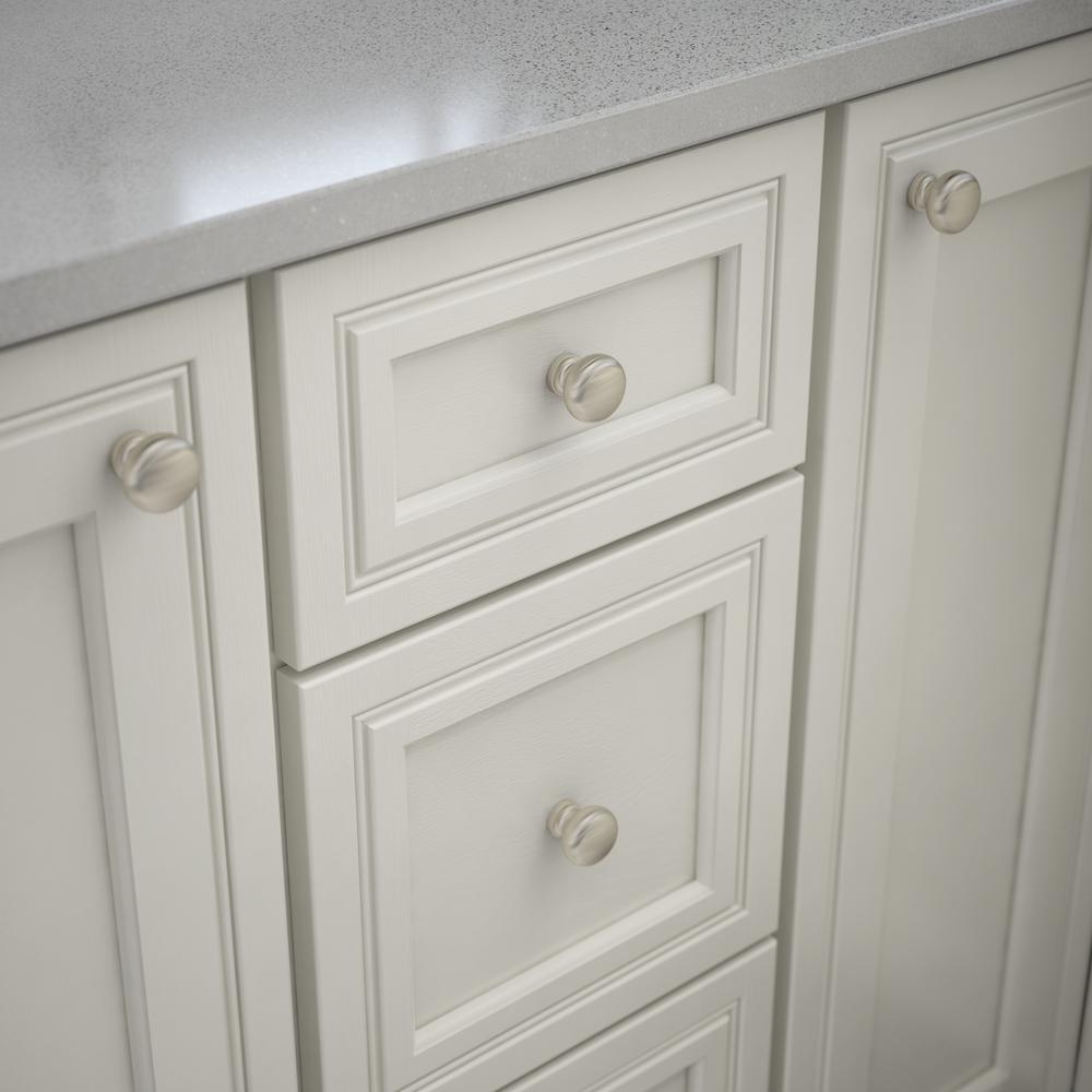 The Liberty 1-1/8 in. Satin Nickel Round Knob adds a contemporary note to cabinetry throughout your home. A simple change can give any room a brand new look and feel. The high-quality die-cast zinc body features a satin nickel finish, and the knob features a rear-mount installation.