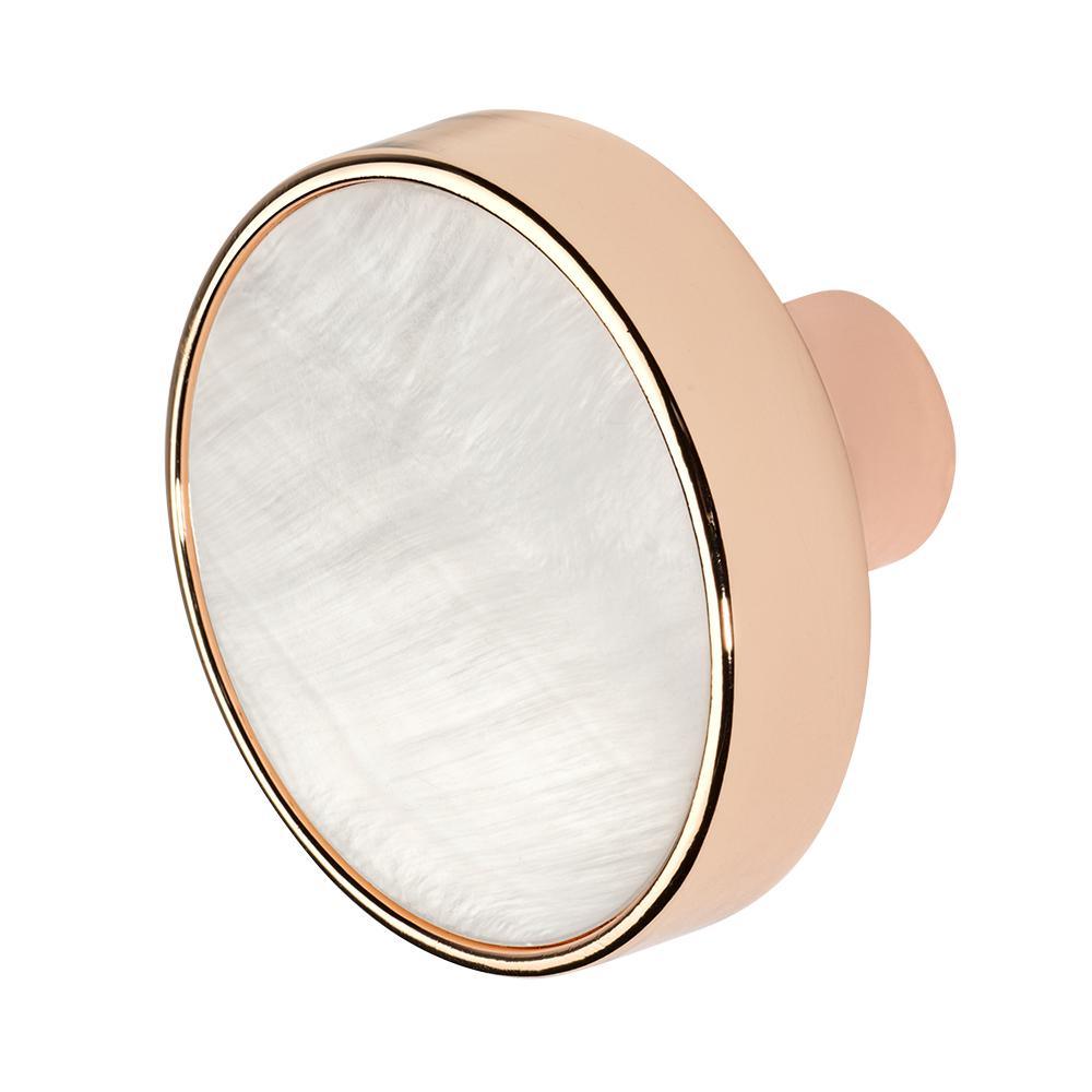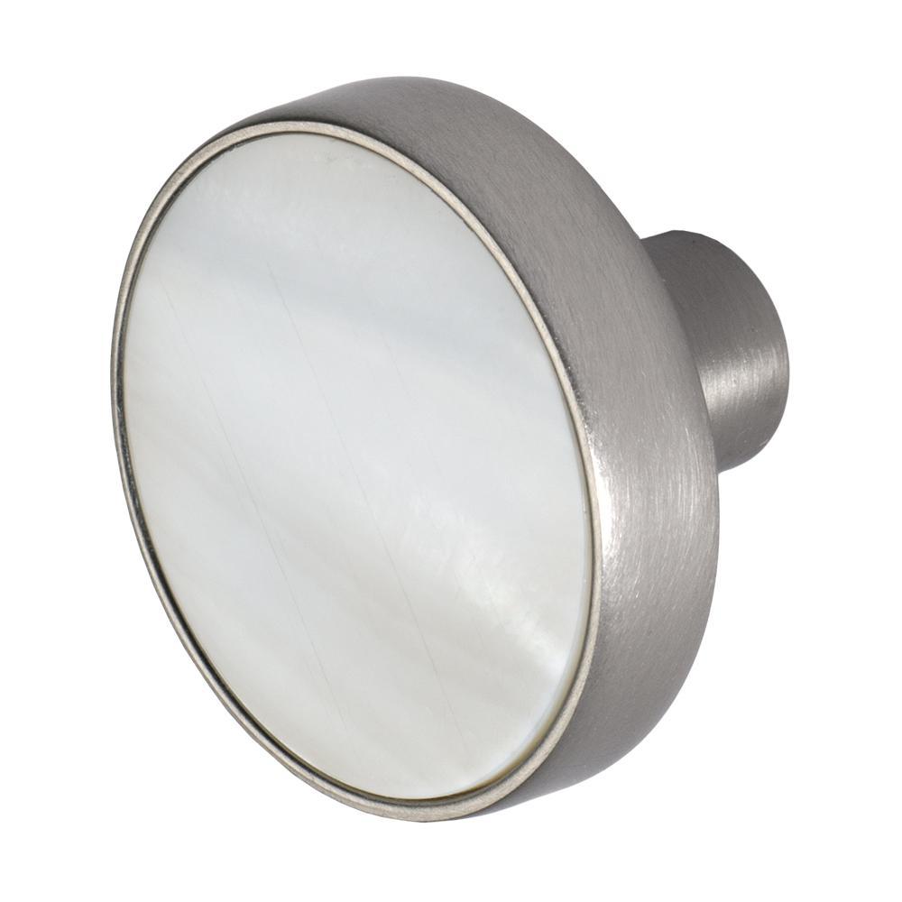This knockout of a knob has a clean, modern design, with a very natural insert. The insert material is farmed, fresh water, mother of pearl. This natural filling makes every piece unique.