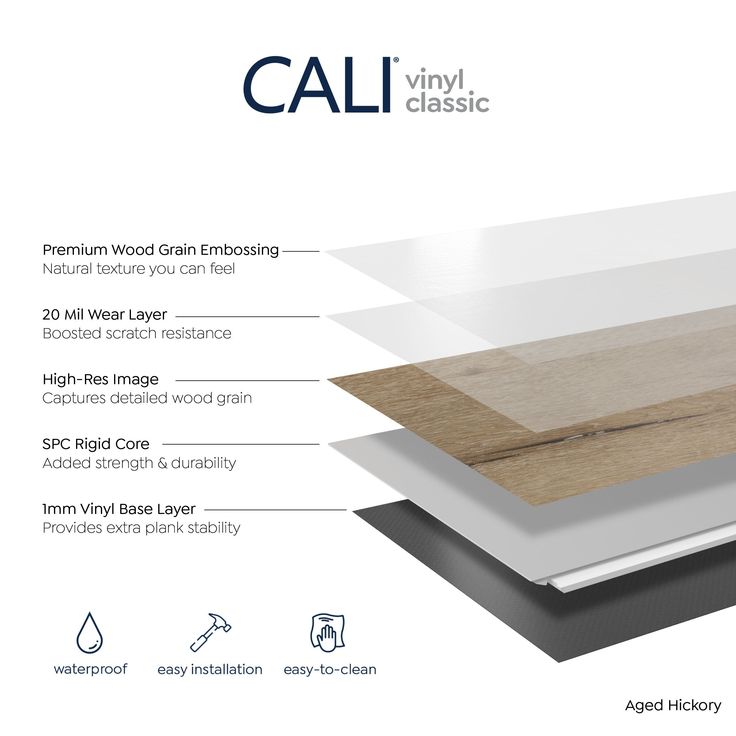 Cali Vinyl Pro offers more beautiful luxury vinyl plank flooring with double the pattern variety, authentic wood grain patterns, and commercial-grade durability An extra scratch-resistant 20mil wear layer shields planks from large pets, high heels, and heavy traffic Planks are 100% waterproof and easy to clean, making them ideal for kitchens, bathrooms, kids’ rooms, and basements A compressed limestone composite rigid core foundation provides added dimensional stability and indent protection Cali Vinyl is Floorscore Certified and made without harmful toxic chemicals, making it safe for homes, hospitals, children, and pets Flooring is lightweight, simple to score and cut, and features a rapid click-lock groove system for fast, easy DIY floating or glue-down installations Cali Vinyl is built to last and backed by a 50-year residential and 15-year commercial warranty