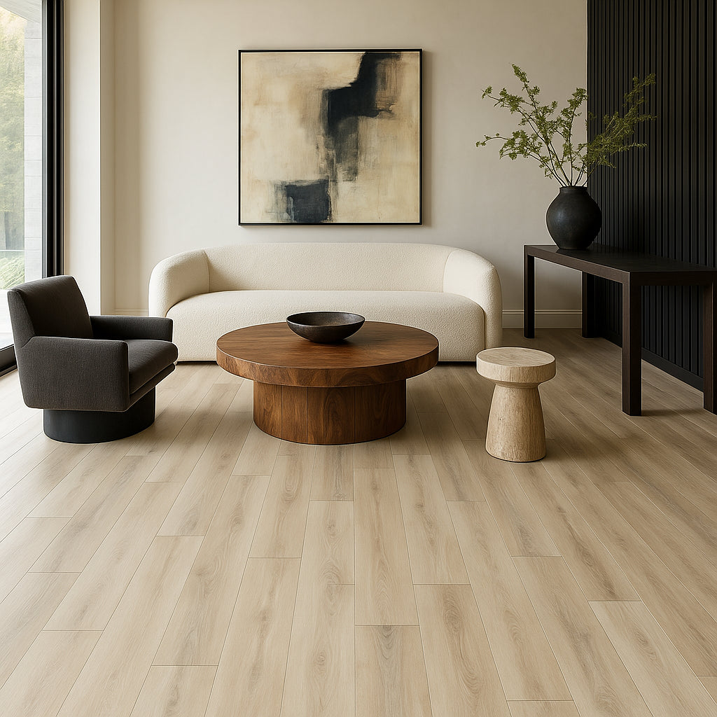 The CALI Salty Strand Vinyl Plank Flooring transforms any room into a serene retreat with its light, wood-grain finish reminiscent of coastal shores. Its extra-wide planks create a spacious and modern aesthetic, while the durable, waterproof design ensures lasting beauty. Pair it with minimalist furniture and natural accents to complete the look. This flooring is not just a choice; it's a statement of refined living.