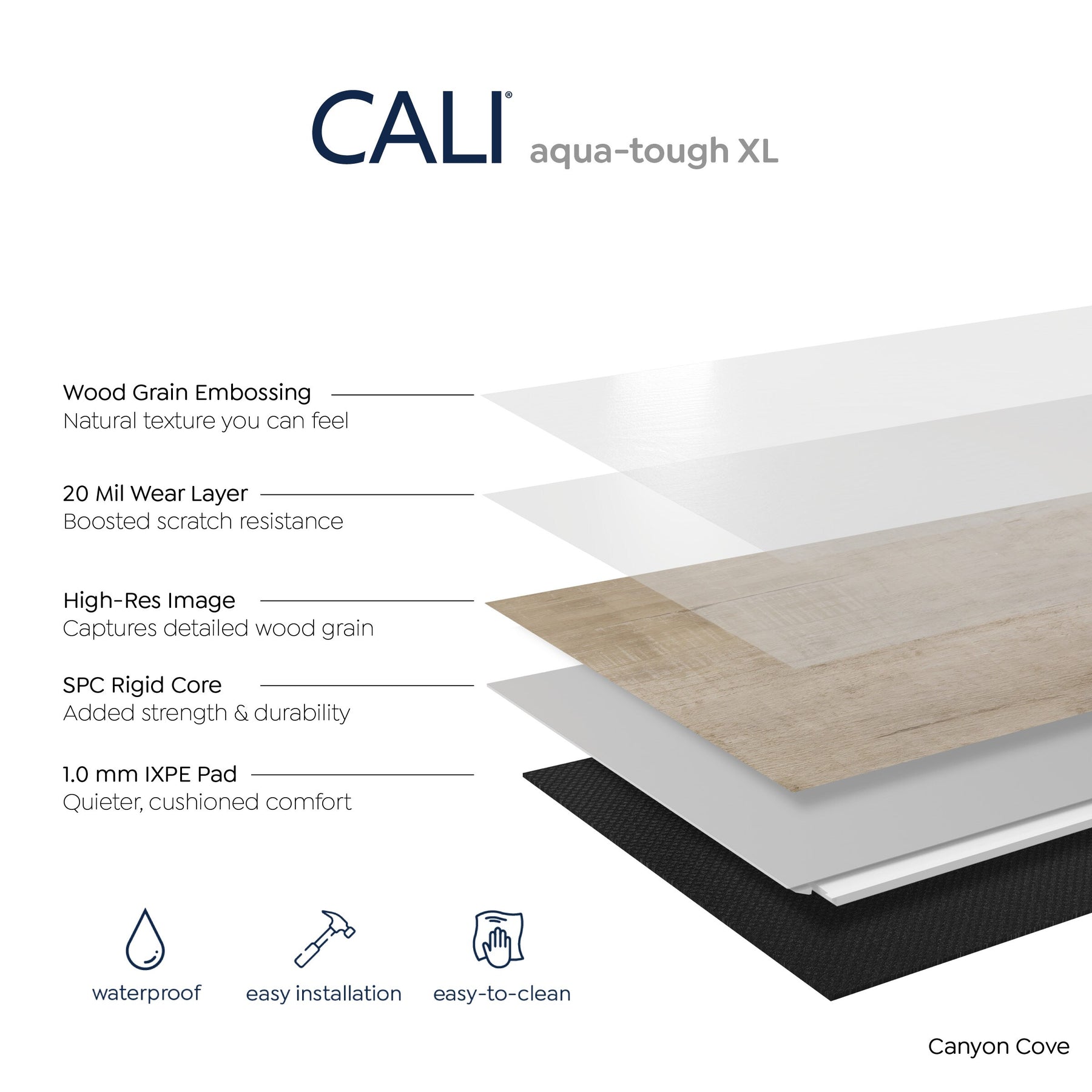 CALI Aqua Tough XL luxury vinyl planks combine a rigid limestone-composite core with a 20‑mil wear layer for commercial-grade durability. The 9-in x 60-in extra-wide, wood-look planks are 100% waterproof with attached pad for quieter, cushioned comfort—perfect for kitchens, baths, basements, and busy spaces.