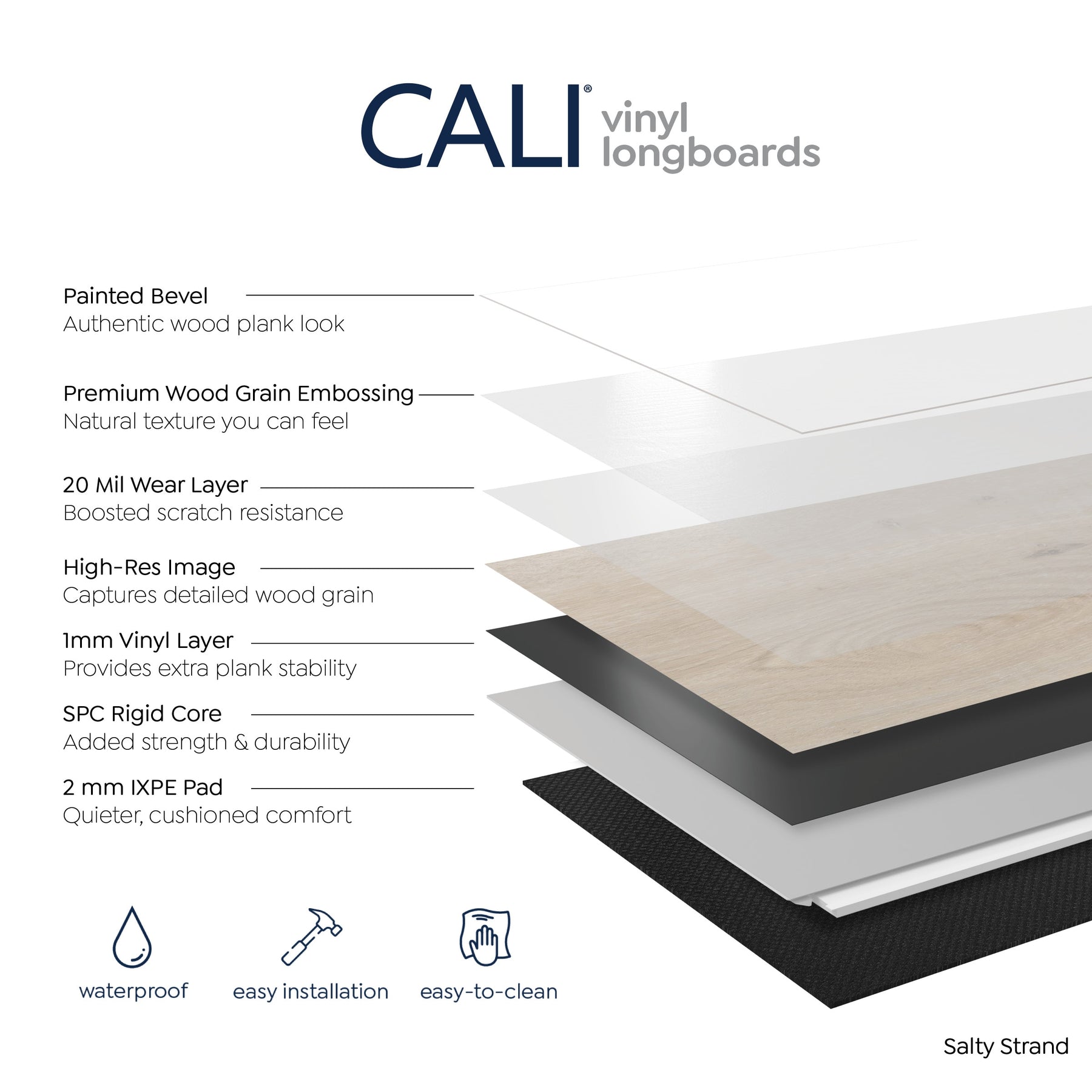 Engineered for busy homes, CALI Longboards Salty Strand luxury vinyl planks combine a rigid SPC core with a 20‑mil wear layer for durable, waterproof performance. Extra‑long, extra‑wide planks showcase natural wood grain embossing and a painted bevel for an authentic look, with attached IXPE pad for quieter, cushioned steps.