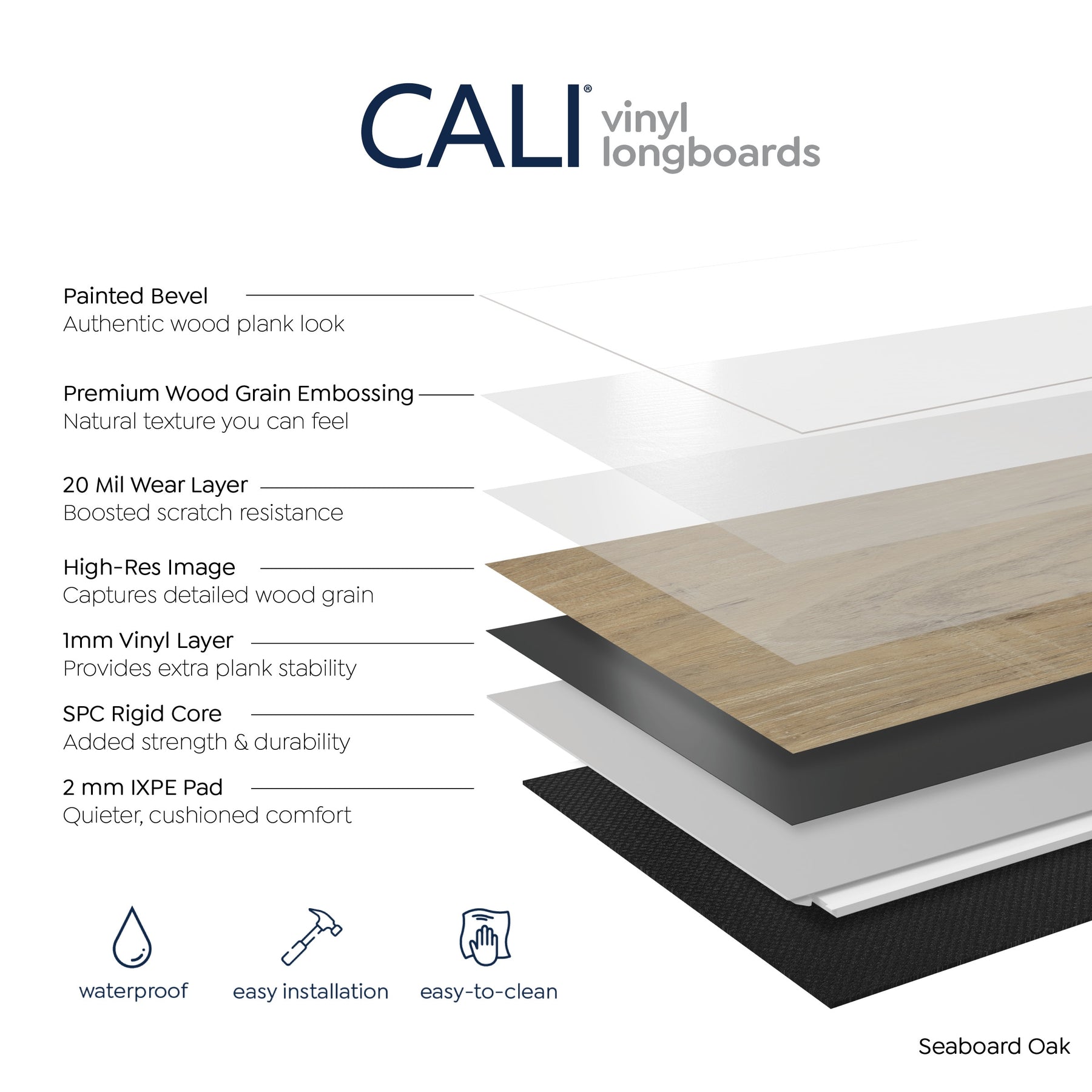 CALI Longboards Seaboard Oak brings extra‑long, extra‑wide SPC vinyl planks with a 20‑mil wear layer for heavy‑traffic durability. Fully waterproof with attached IXPE pad and click‑lock installation, it delivers realistic oak grain, easy maintenance, and comfort underfoot for kitchens, baths, and basements.