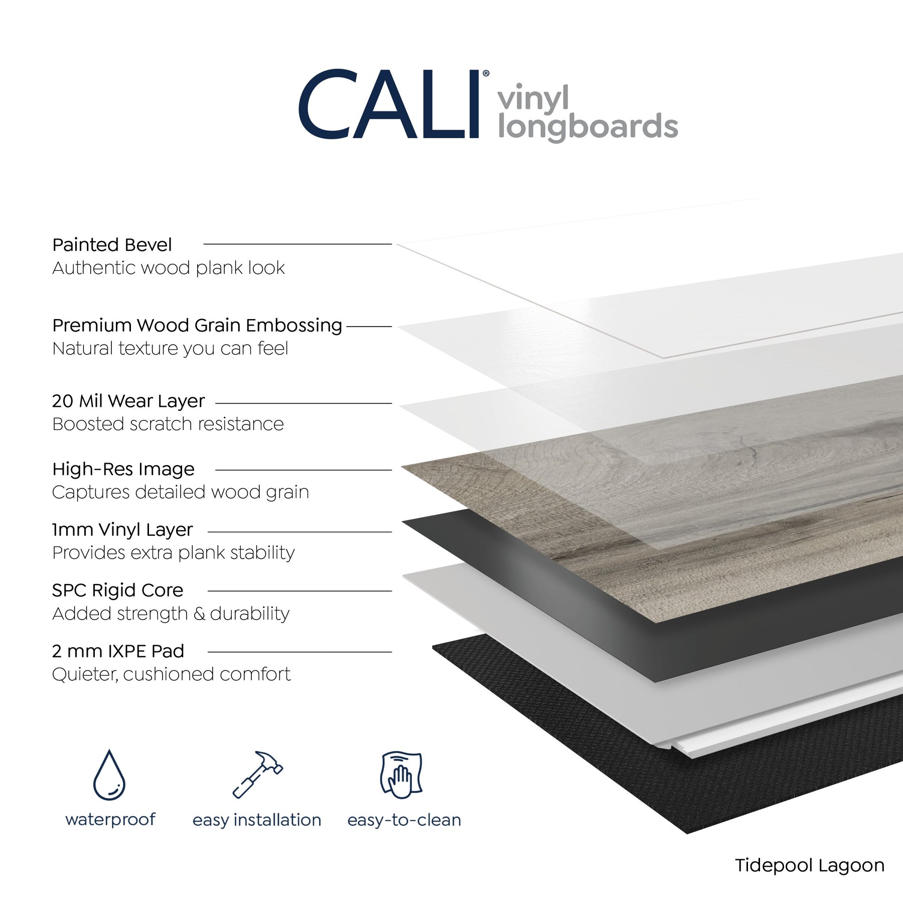 Engineered for heavy traffic, CALI Longboards Tidepool Lagoon luxury vinyl planks combine a 20‑mil wear layer with an SPC rigid core for superior dent and scratch resistance. Extra‑long, extra‑wide planks showcase realistic gray wood visuals and install quickly with a drop‑lock interlocking system and attached IXPE pad for quiet comfort.