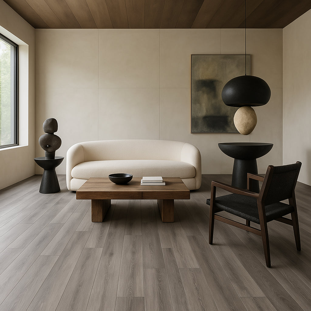 The CALI Mute Step Breakwater Oak flooring transforms any room into a haven of sophistication and comfort. Its authentic wood grain texture and medium gray tones create a serene ambiance, perfect for modern or rustic interiors. Pair it with minimalist furniture to highlight its natural beauty, or use it as a neutral base for bold decor accents. This flooring is not just a surface—it's a statement of refined living.