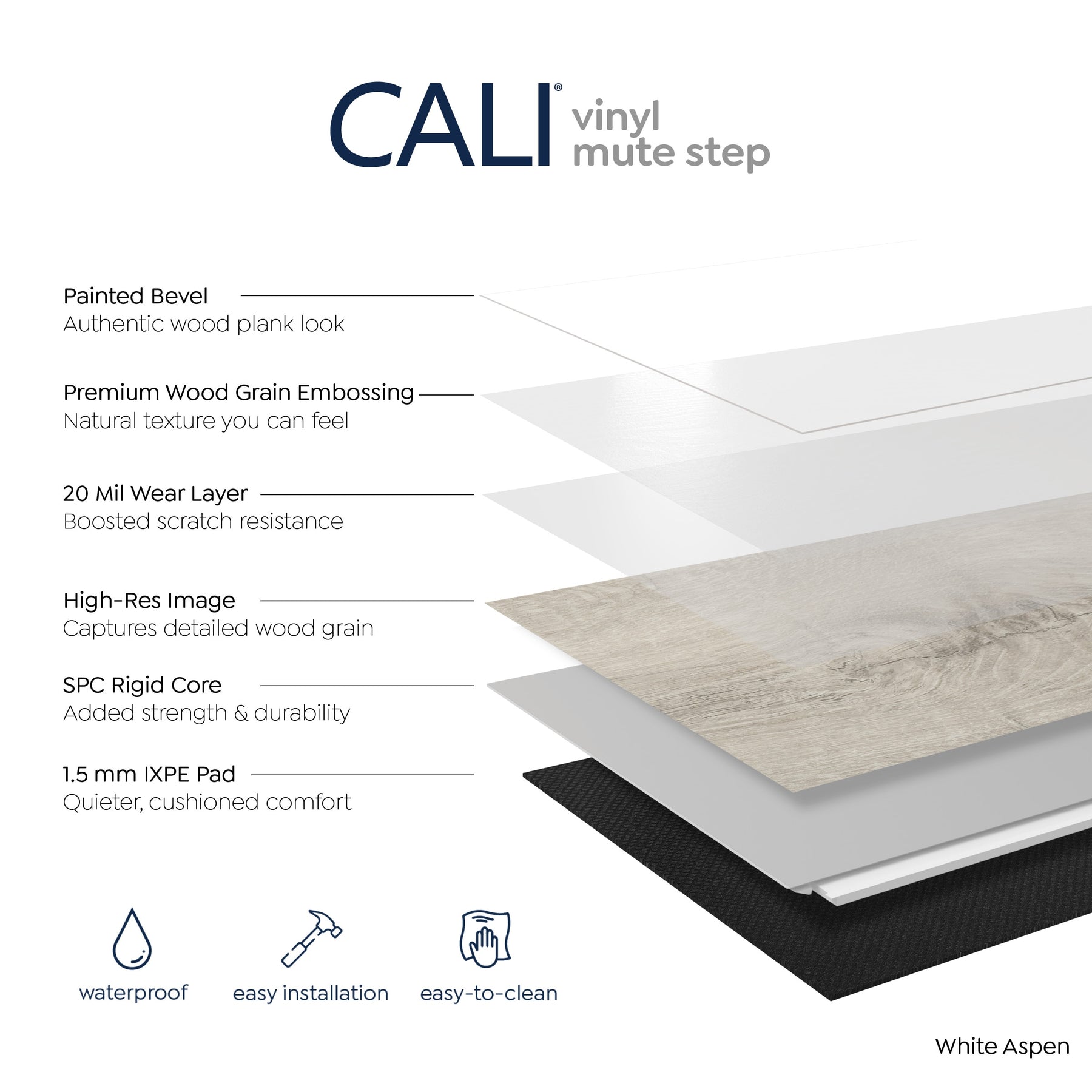 Upgrade to CALI Mute Step White Aspen for waterproof durability, quiet comfort, and a stunning wood-look finish—order your carton today.