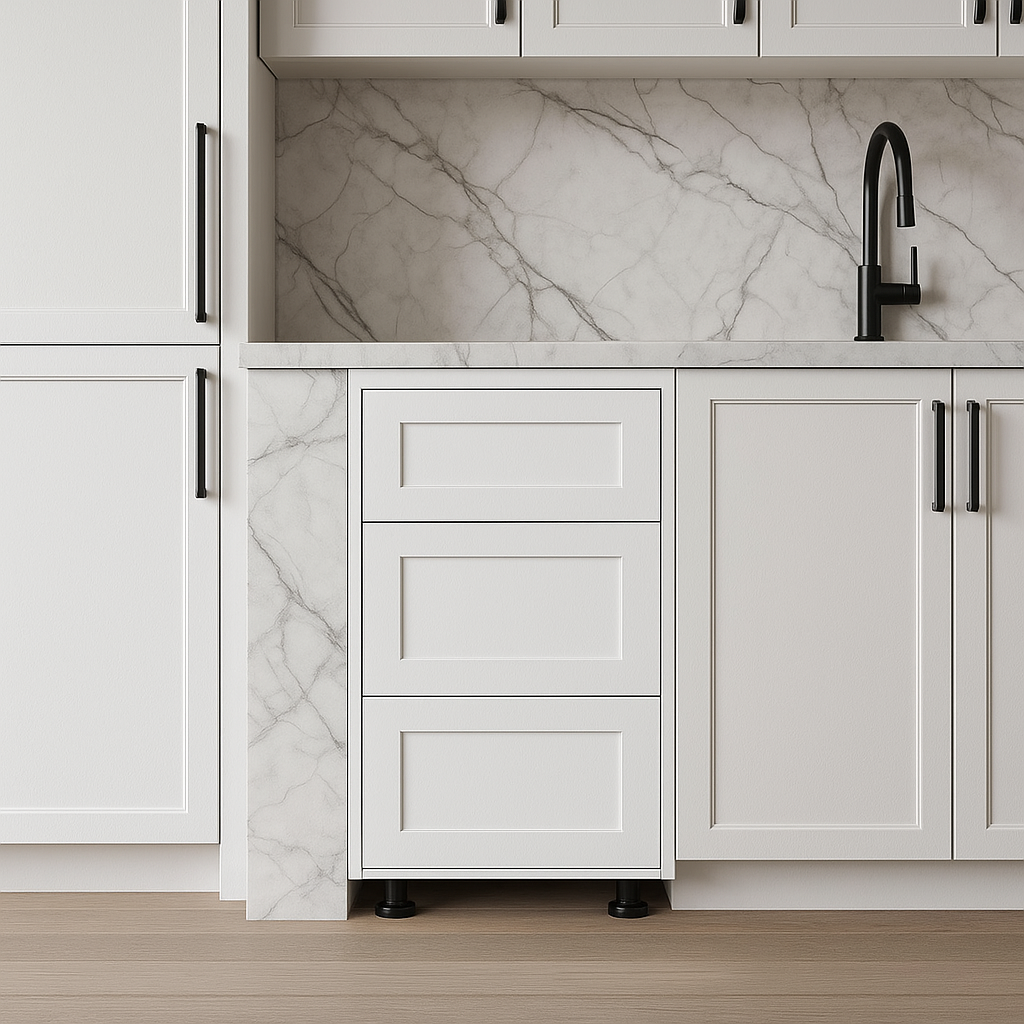 The Cambridge Everest Shaker Drawer Base Kitchen Cabinet combines modern design with practical functionality. Featuring a frameless construction and soft-close drawers, this cabinet is crafted from durable MDF and melamine materials, finished in a sleek matte white lacquer.