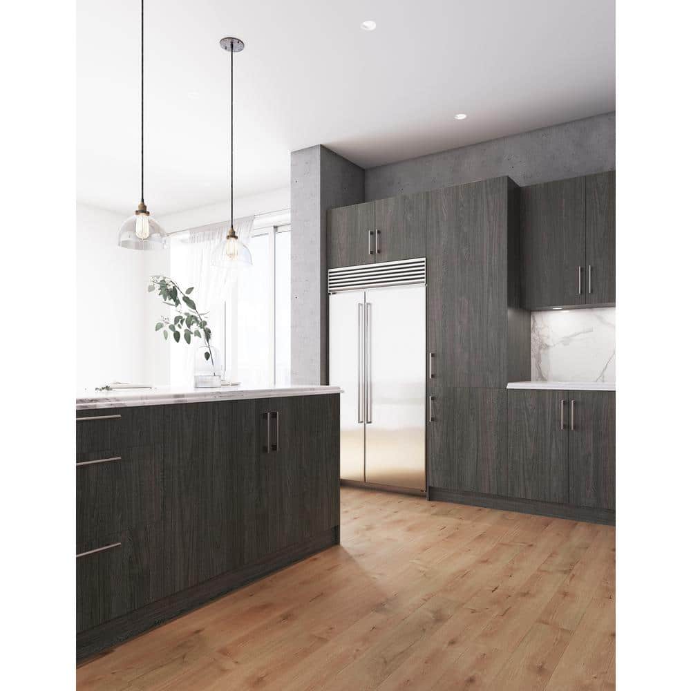 A: The cabinet has a dark, sleek Carbon Marine laminate finish, perfect for a modern kitchen aesthetic.