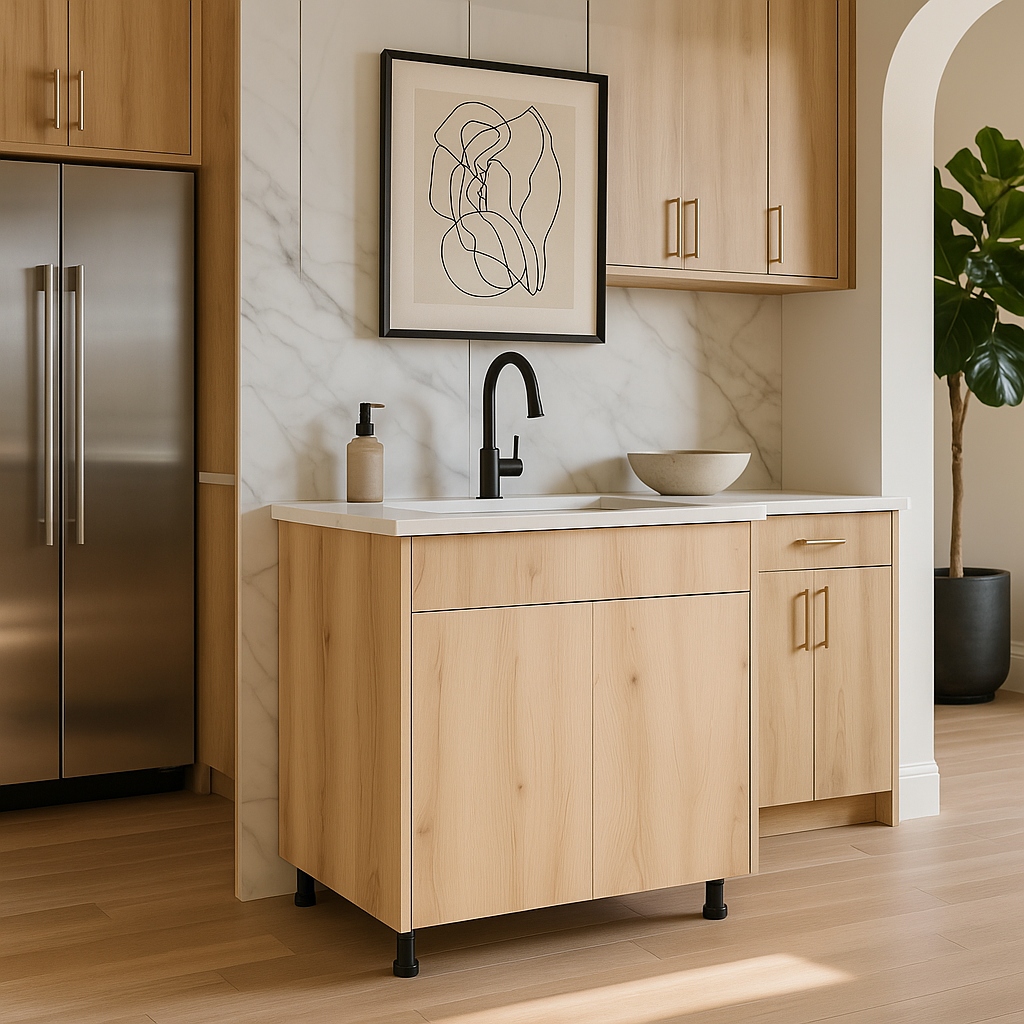 The Cambridge Radiance Sink Base Cabinet combines modern design with practical functionality. Featuring a Light Oak Laminate finish and soft-close mechanisms, this ready-to-assemble cabinet is perfect for enhancing your kitchen's style and usability.
