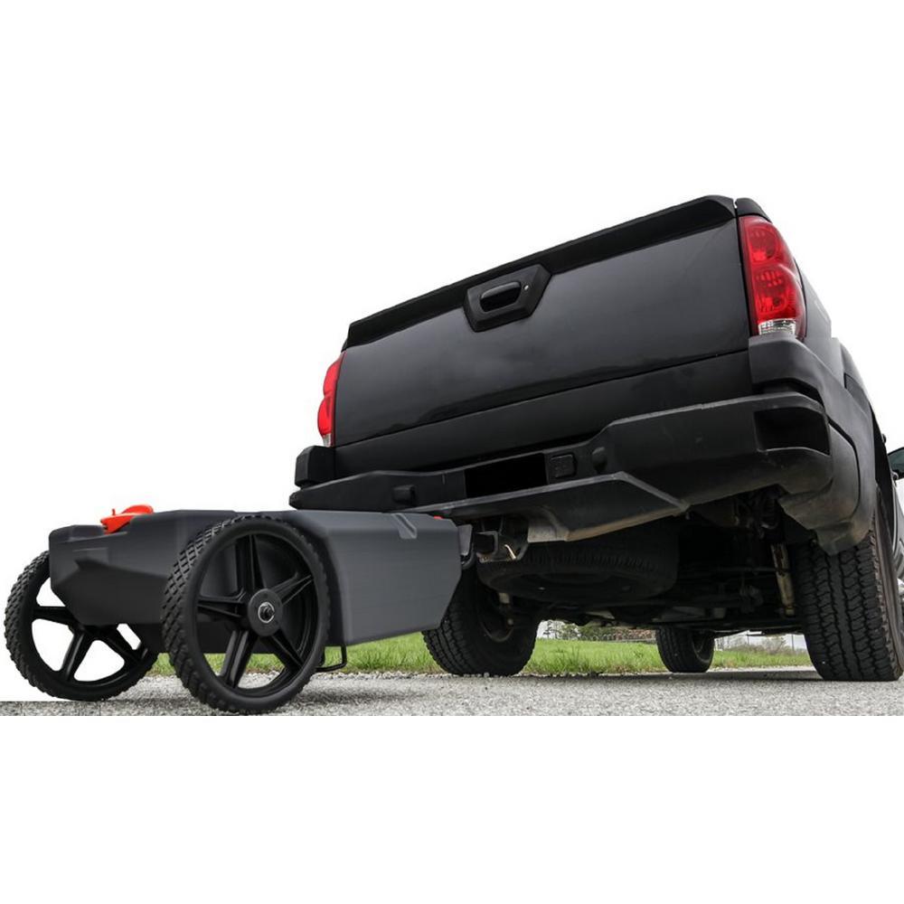 - Large, heavy-duty, no-flat wheels with bearings make transport smooth and easy and removable steel tow adapter allows you to easily roll the tote tank like a suitcase or tow it slowly behind a golf cart or truck