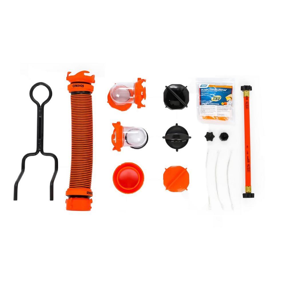 Regular price $96.18Ready to use kit includes: -21 Gal. tote tank with large, durable handle, oversized wheels, tank rinser and ladder hook - 15 female-to-female orange Rhino greywater hose - 3 in. RhinoEXTREME sewer hose with swiveling bayonet and lug fittings - Clear double bayonet elbow - Clear bayonet elbow with removable 4-in-1 adapter - Bayonet and lug storage caps for the hose - 3 Rhino Drop-Ins. Steel tow adapter. Caps with included lanyards - Instruction sheet.