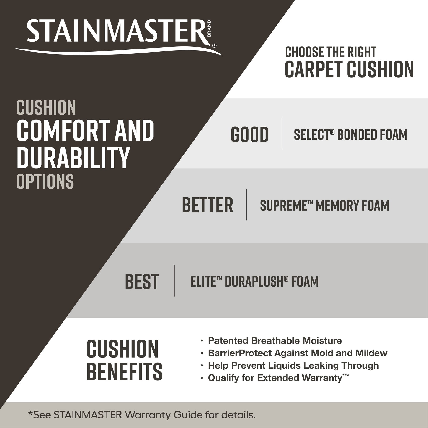A stylish, patterned STAINMASTER carpet made with Tryesse-Pro solution-dyed polyester for softness and durable stain and soil resistance. Ideal for living rooms, bedrooms, and hallways, the 12‑ft roll width makes installation straightforward while the off-white Tropical Beach color brightens any space.