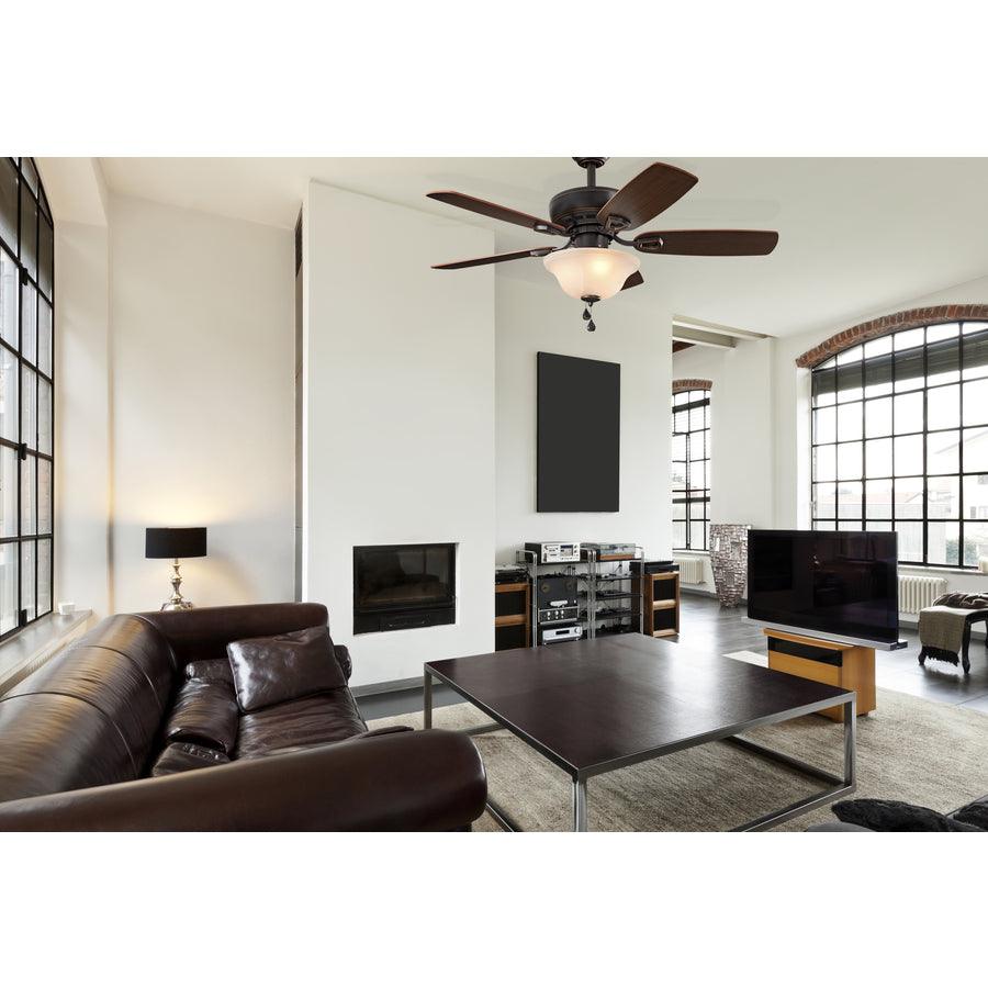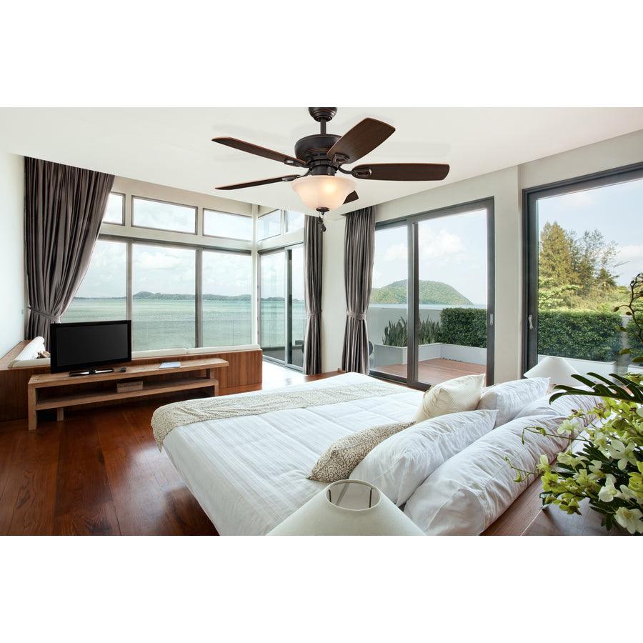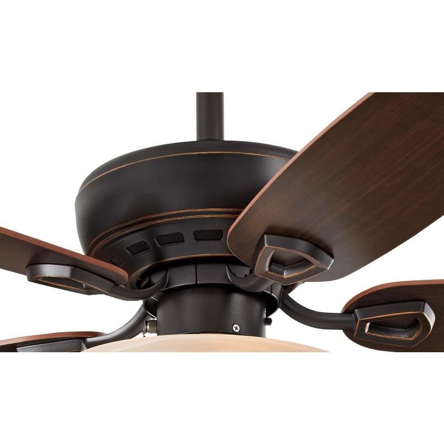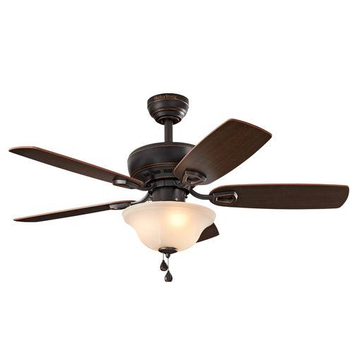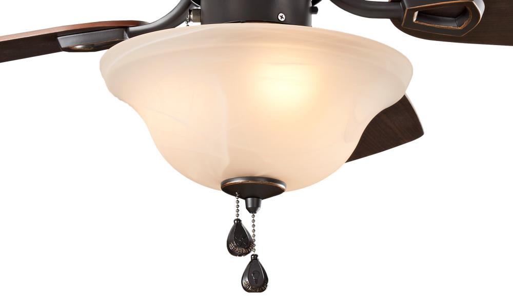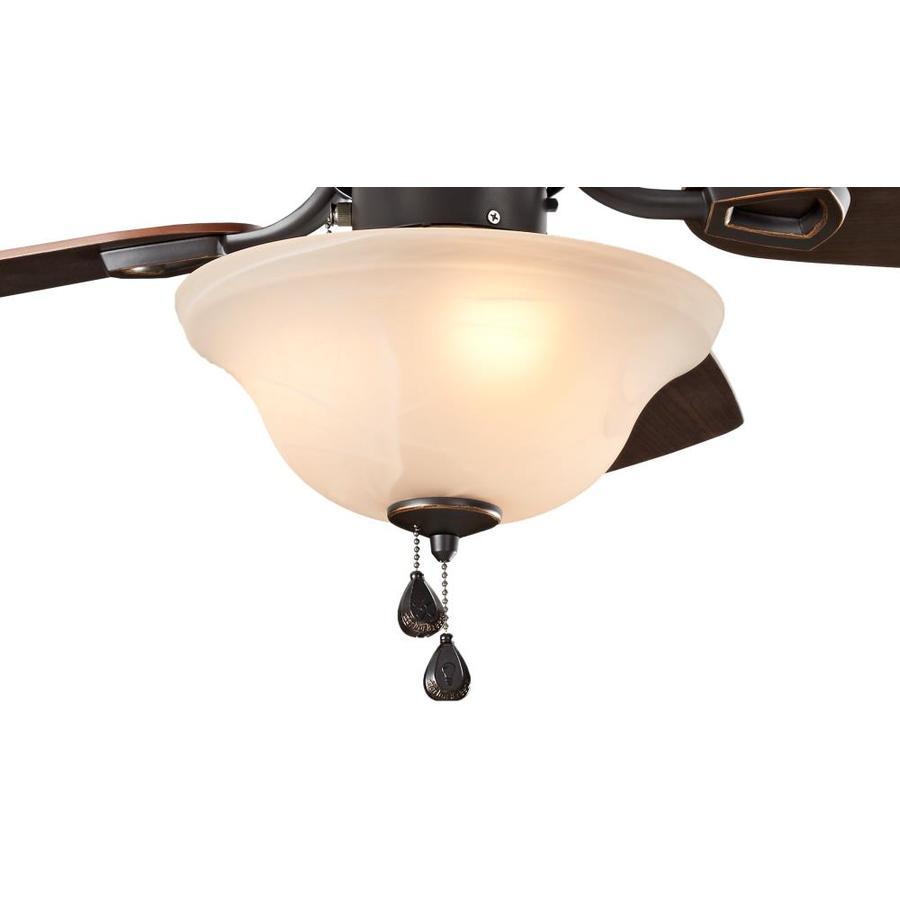 The Harbor Breeze Sage Cove 44-in ceiling fan delivers dependable airflow for small rooms with a warm bronze finish and reversible toffee/cocoa blades. Its frosted bowl light kit with two incandescent bulbs provides soft, ambient illumination, while the 3-speed pull chains and reversible motor offer year-round comfort.