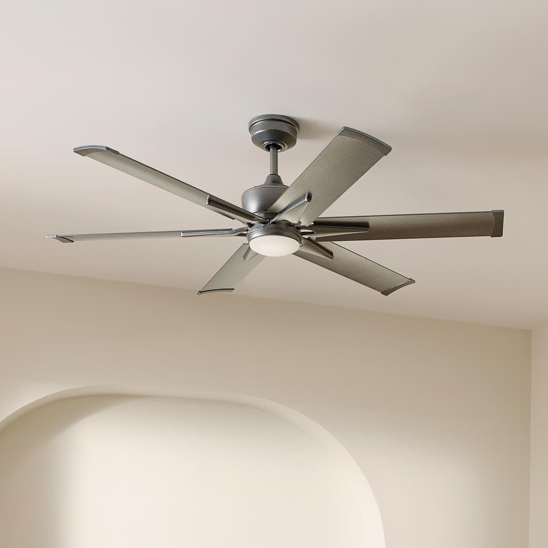 The Kichler Szeplo Patio 60-inch ceiling fan brings industrial-inspired styling and powerful air movement to covered outdoor or indoor spaces. Finished in Weathered Steel Powder Coat, it features six blades and an integrated light for year-round comfort and illumination.
