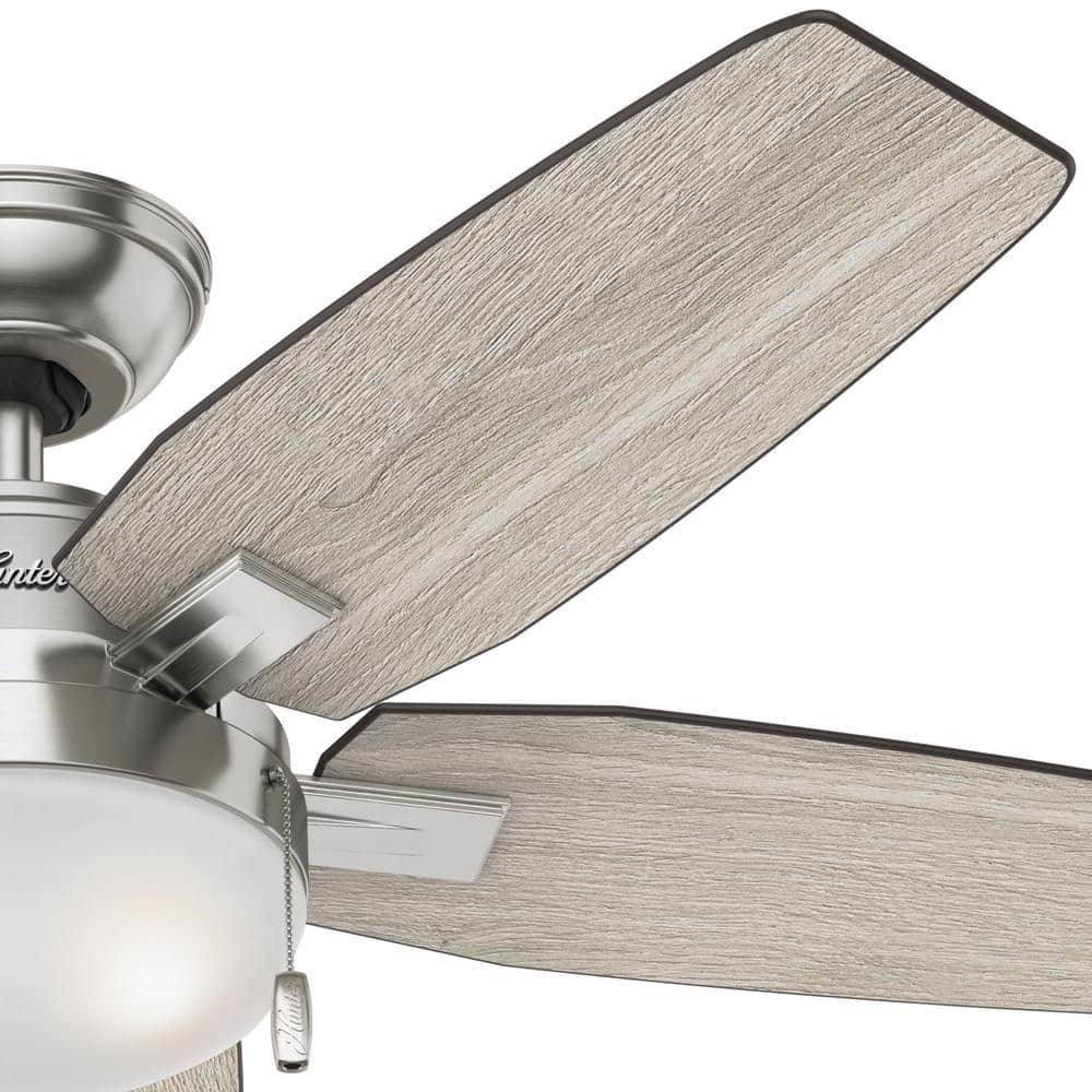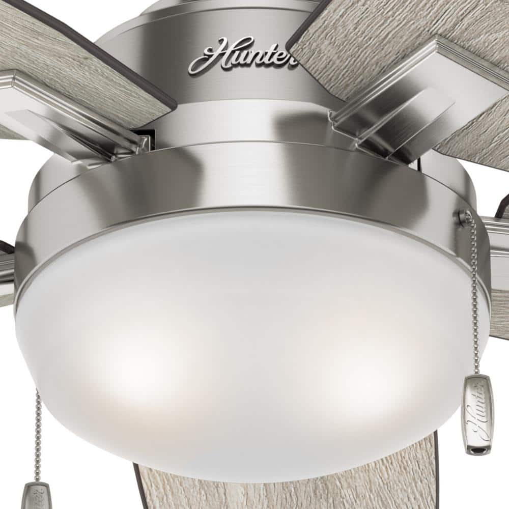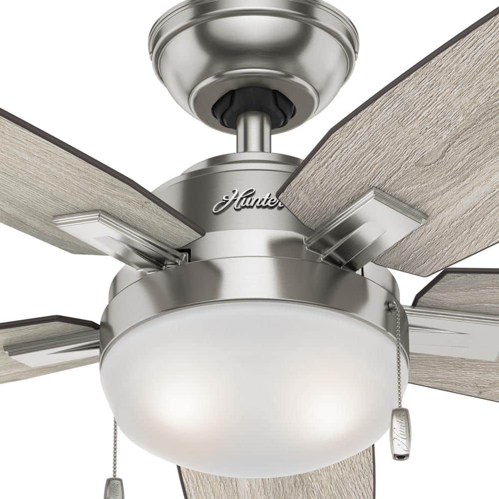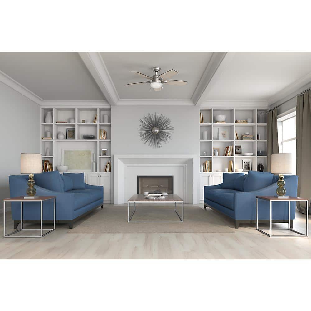 The Hunter Antero 46-inch ceiling fan delivers quiet, powerful airflow for small rooms with a sleek brushed nickel finish. It includes a two-light kit with energy-efficient LED bulbs and reversible blades in Light Gray Oak and Burnt Walnut to match your decor.