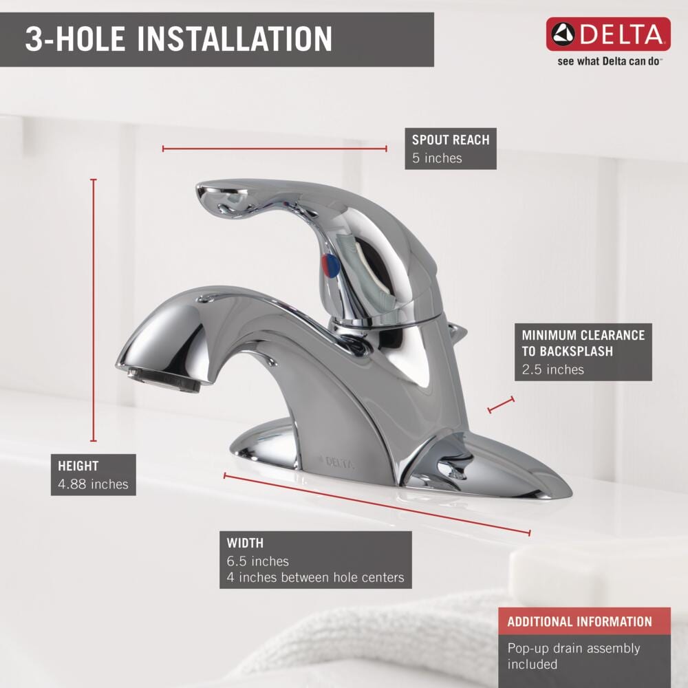 The Delta Classic single-handle bathroom faucet delivers reliable performance in a polished chrome finish. WaterSense labeled at 1.2 GPM with DIAMOND Seal Technology and integrated InnoFlex supply lines, it installs on a 3-hole, 4-in centerset sink and includes a metal pop-up drain.