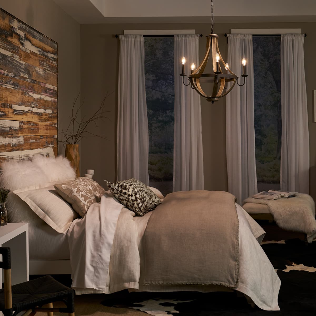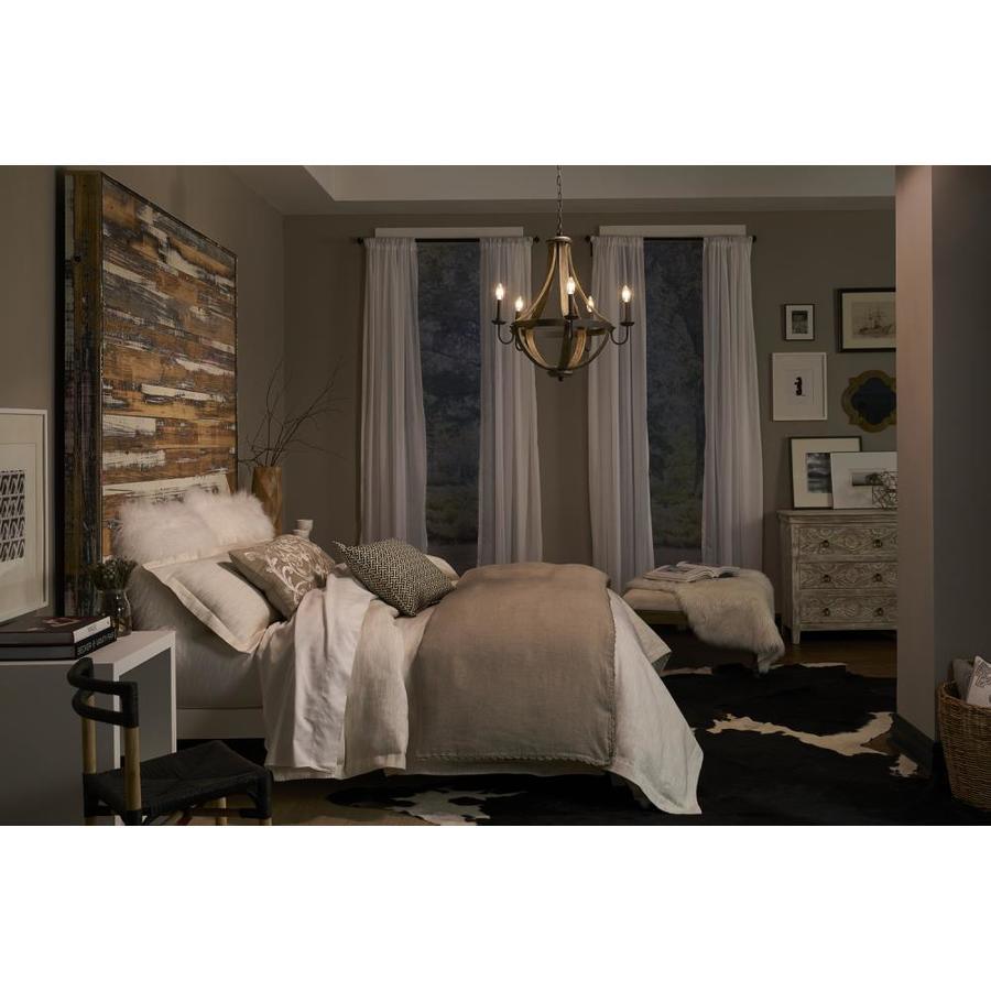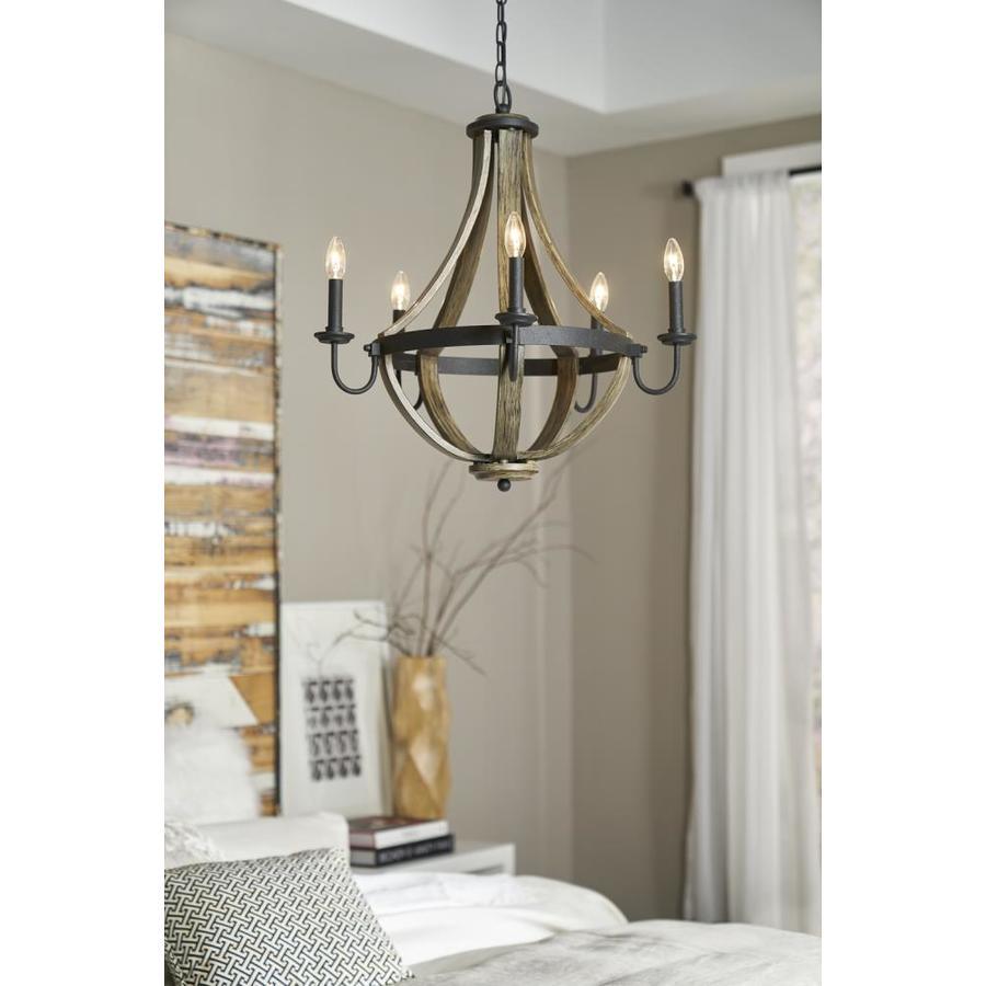 The Kichler Merlot chandelier blends rustic wood-look curves with a distressed black metal finish for a warm farmhouse statement. Five candelabra lights provide inviting ambient illumination, perfect for dining rooms, bedrooms, or entryways.