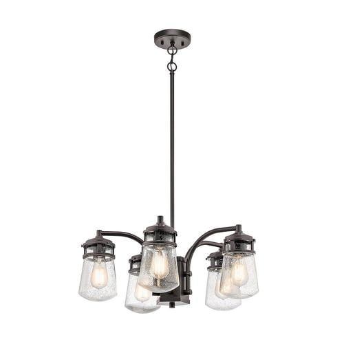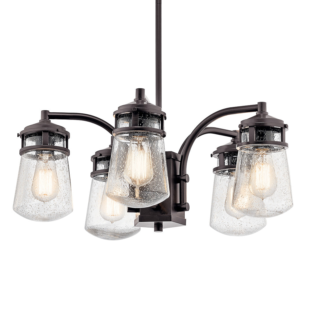 The Kichler Lyndon chandelier blends transitional styling with outdoor-inspired details, featuring an Architectural Bronze finish and clear seedy glass shades. Five medium-base sockets deliver ample illumination with a refined, jar-style silhouette ideal for kitchens, dining rooms, or covered outdoor spaces.