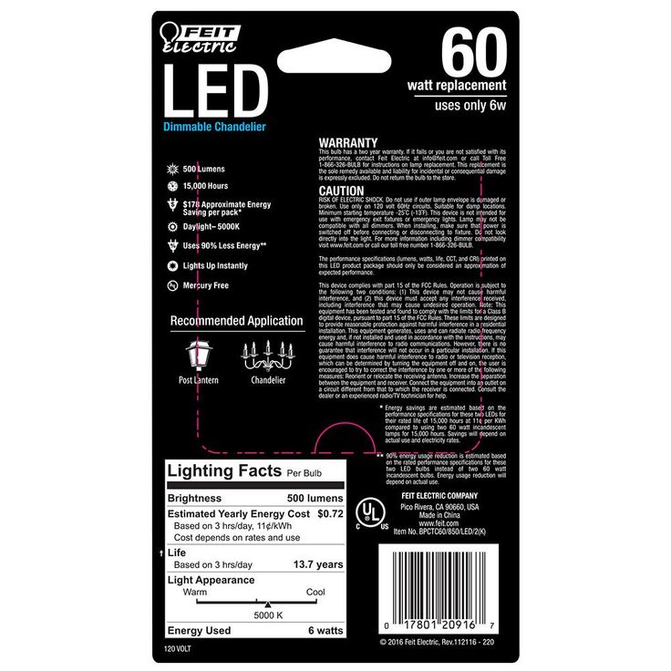 - Energy used: 6-Watts (equivalent to a 60-Watt standard incandescent light bulb)