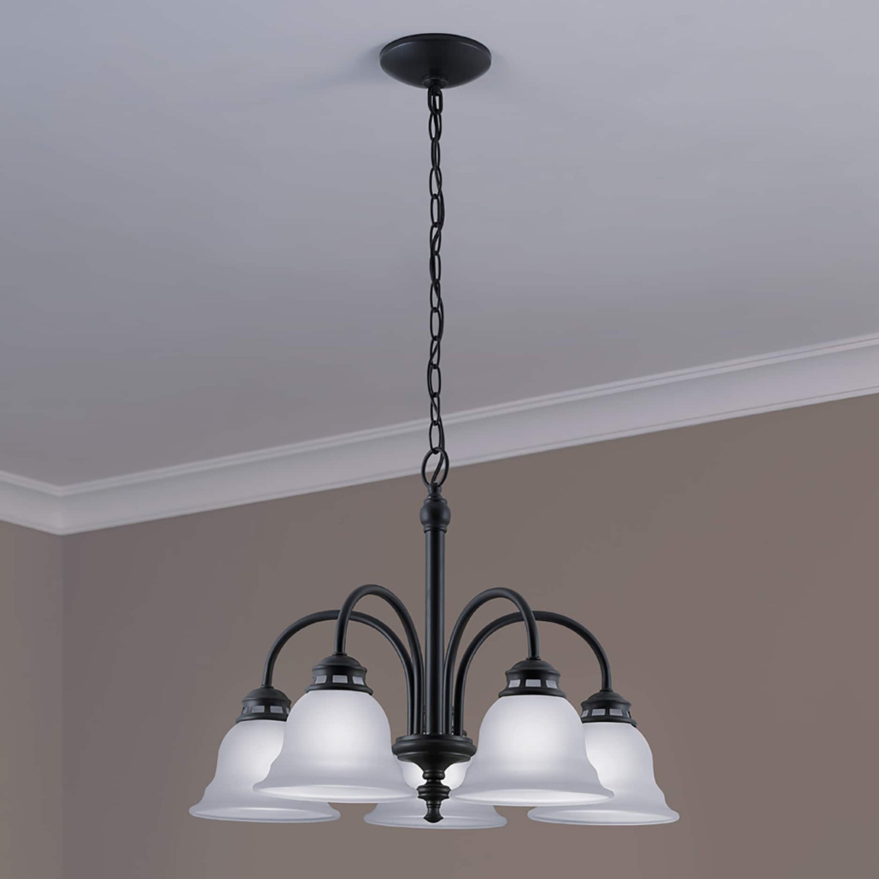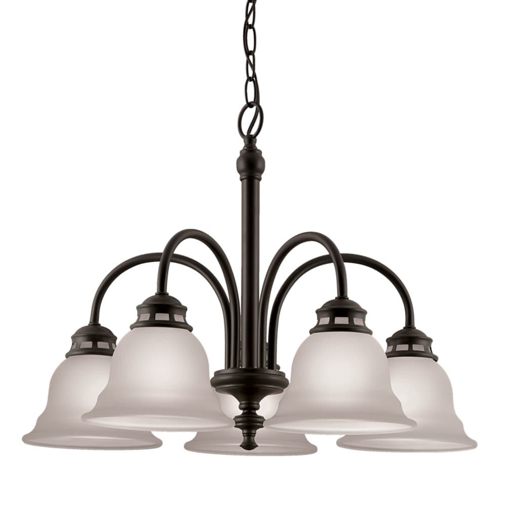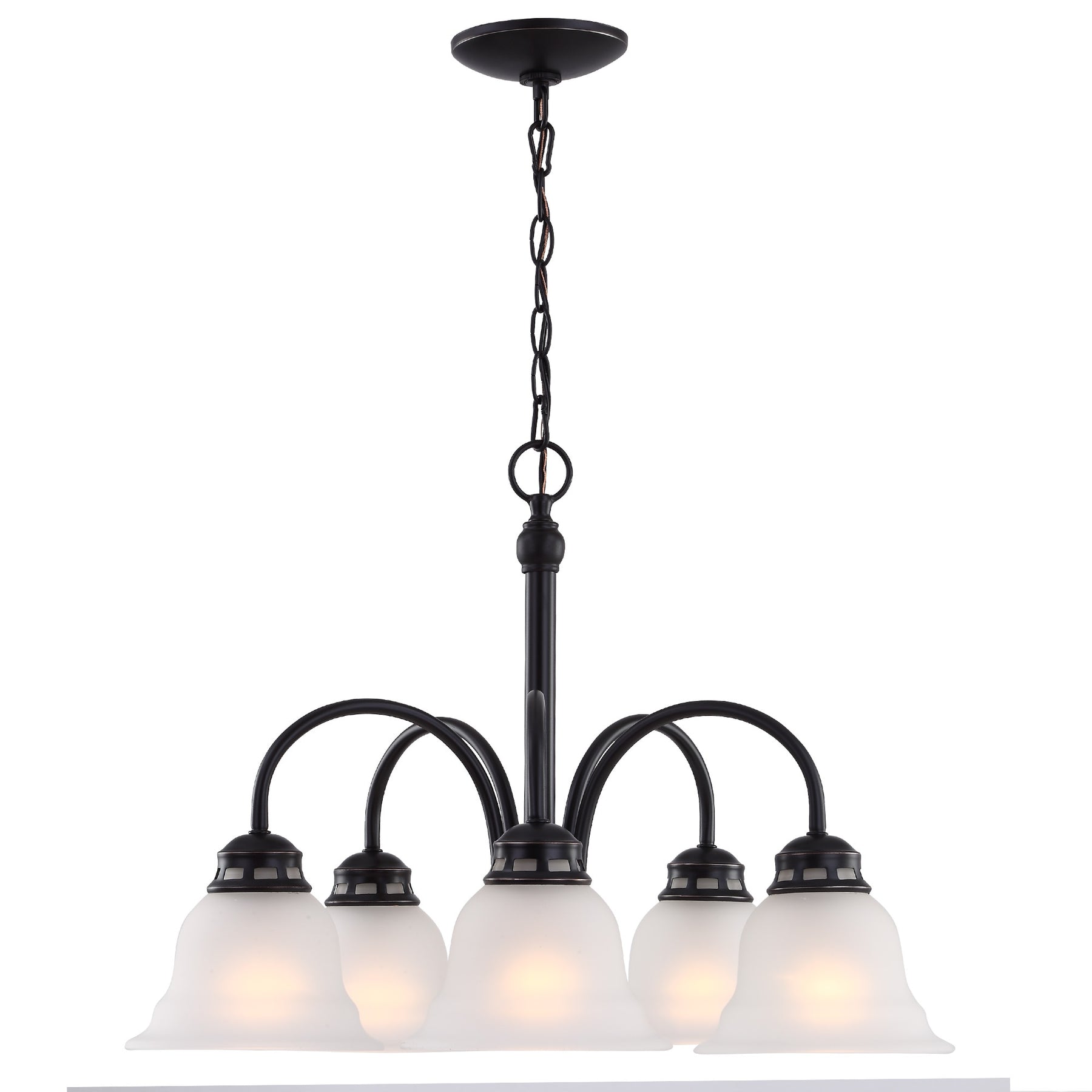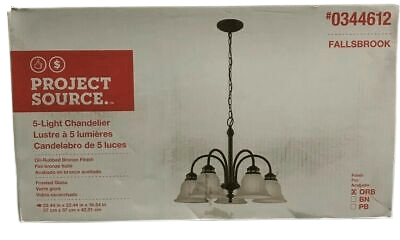 A classic 5-light chandelier from Project Source’s Fallsbrook collection, finished in dark oil-rubbed bronze with frosted etched glass shades. Dimmable and height-adjustable, it’s ideal for dining rooms, kitchens, foyers, and living spaces.