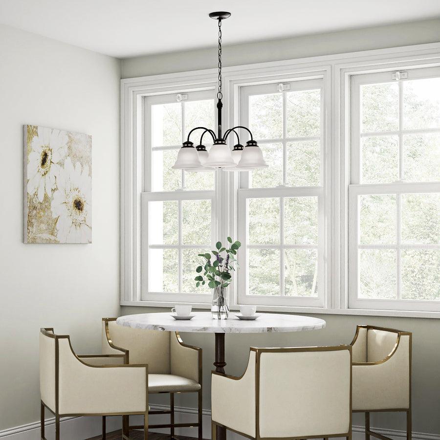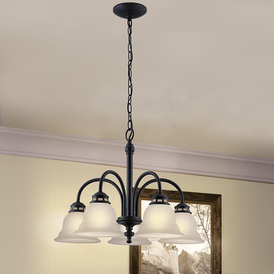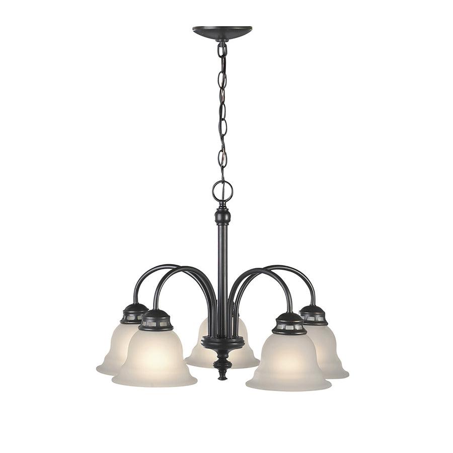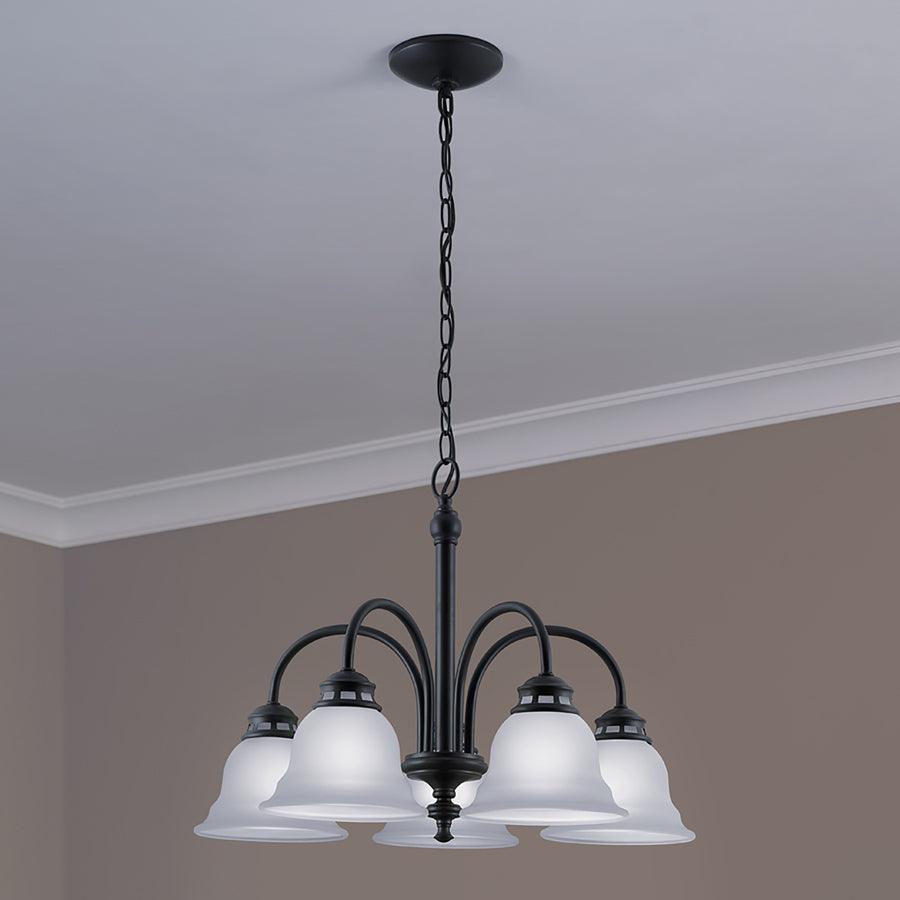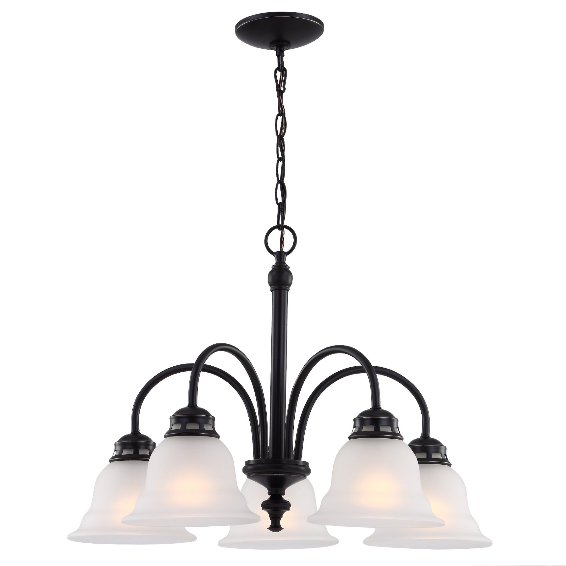 A classic 5-light chandelier from Project Source’s Fallsbrook collection, finished in dark oil-rubbed bronze with frosted etched glass shades. Dimmable and height-adjustable, it’s ideal for dining rooms, kitchens, foyers, and living spaces.