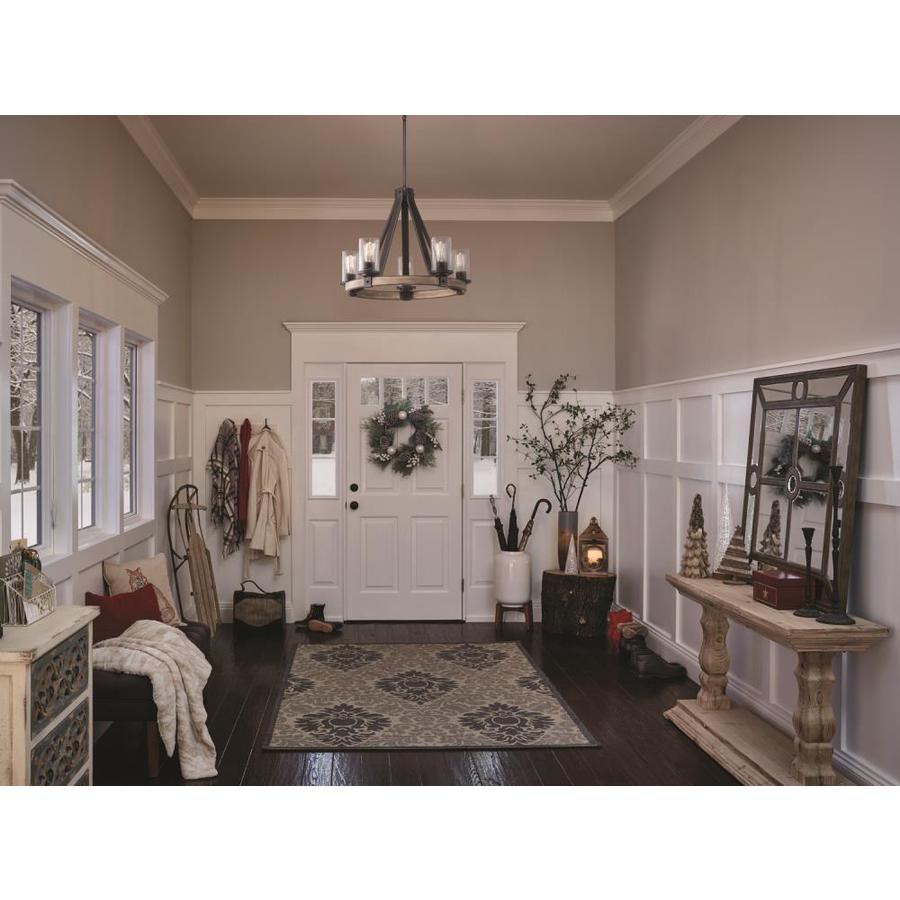 The Kichler Barrington chandelier blends Anvil Iron with Distressed Antique Grey wood and clear seeded glass for a warm, rustic focal point. Its five medium-base lights deliver inviting illumination ideal for dining rooms, kitchens, or entryways.