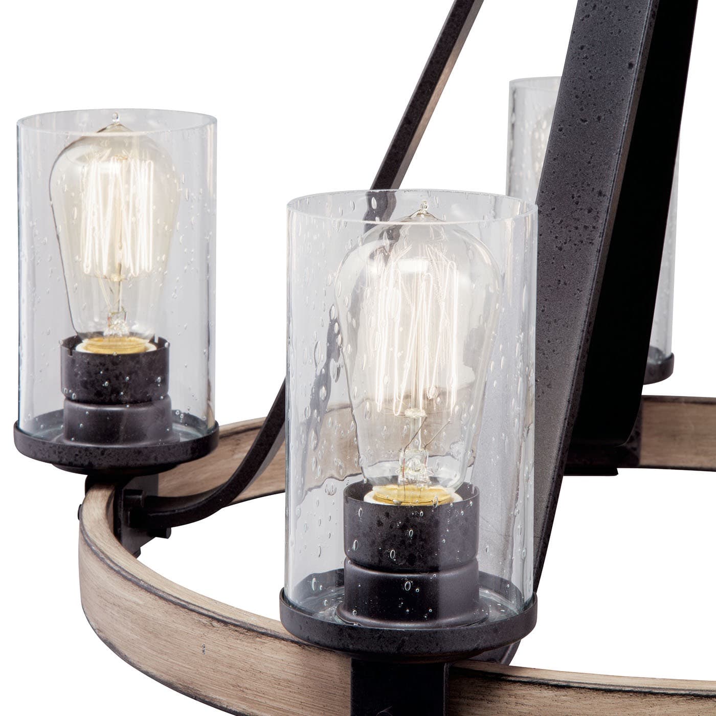 • Rustic Mixed Materials: Anvil Iron frame with Distressed Antique Grey wood ring and clear seeded glass shades