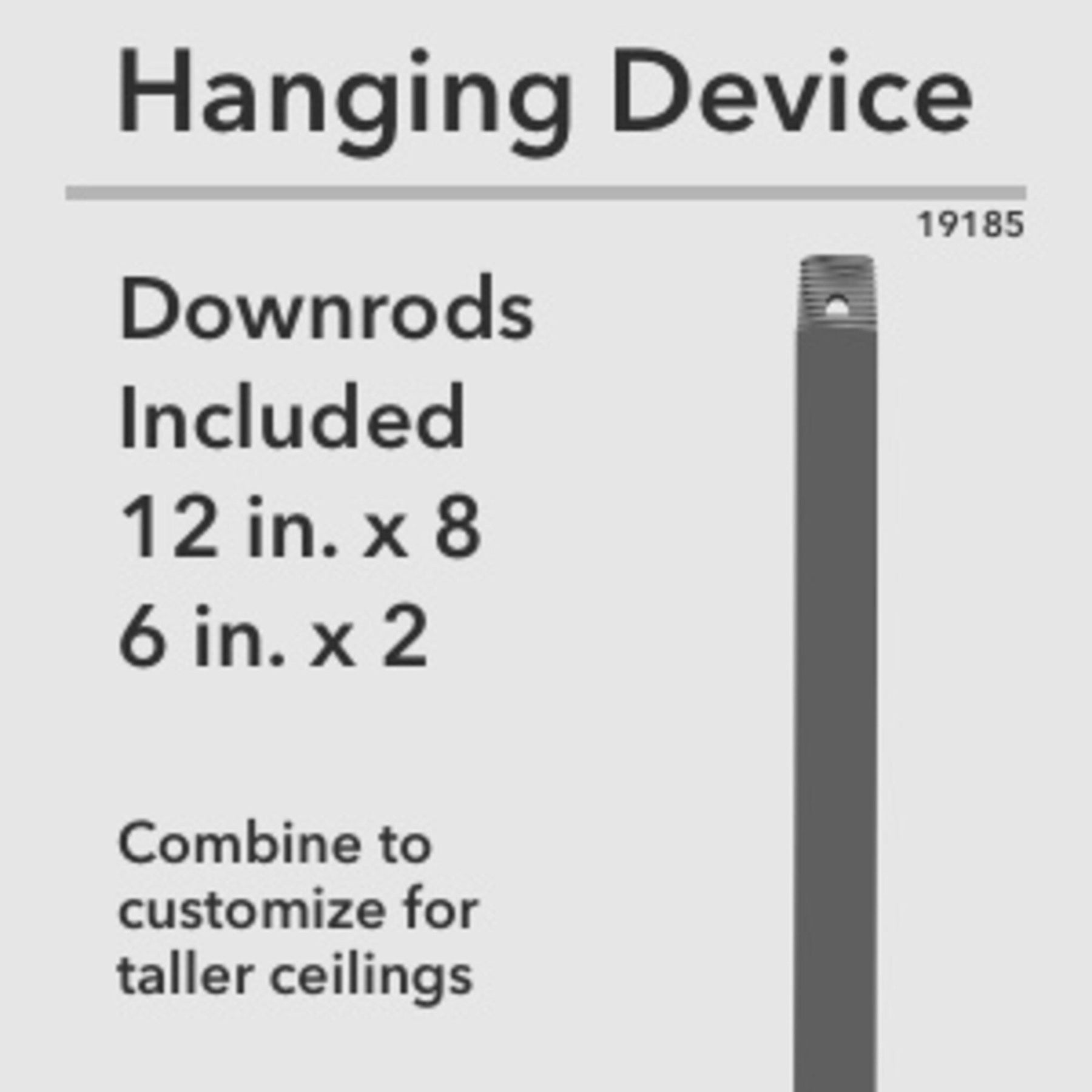 A: Included are one 6-inch and four 12-inch downrods to adjust the hanging height from 18 inches up to 66 inches.