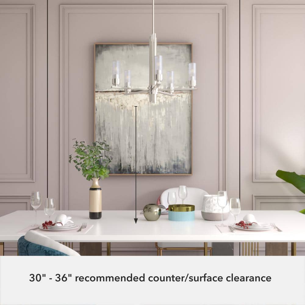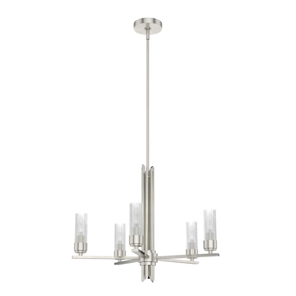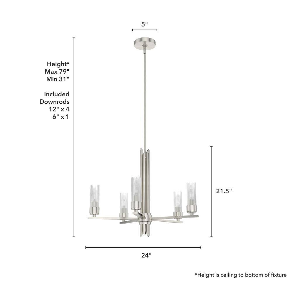 Illuminate your living space with the Gatz 5-Light Chandelier, a shimmering masterpiece that casts ethereal light through its ribbed glass shades. Its brushed nickel finish accentuates the sleek, modern design, elevating your home into a haven of sophistication. Hang above a dining room table or in a foyer to greet guests with its inviting glow, this chandelier is a celebration of luxury and style. Truly, the Gatz chandelier is a vital centerpiece for those who cherish opulent design and ambiance.