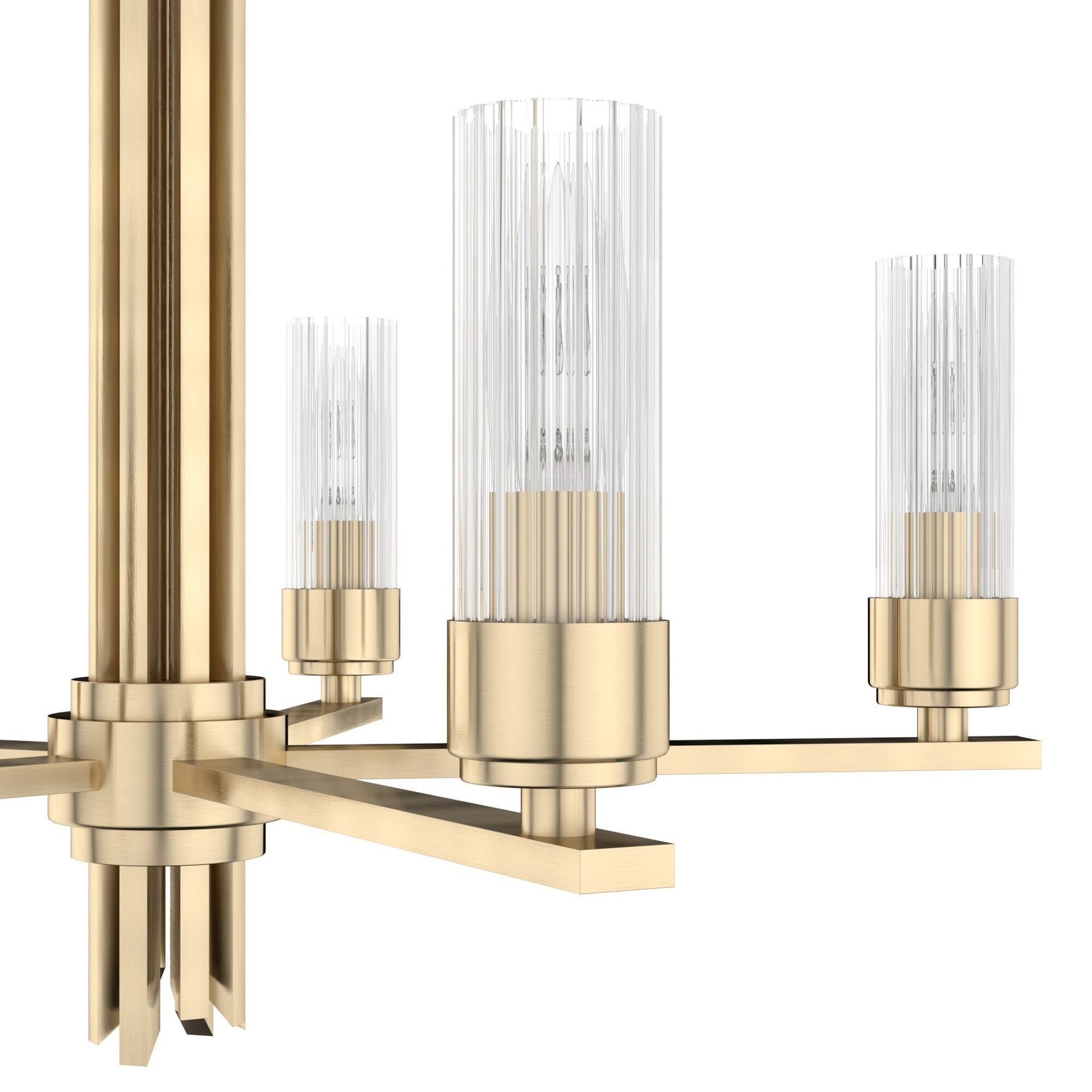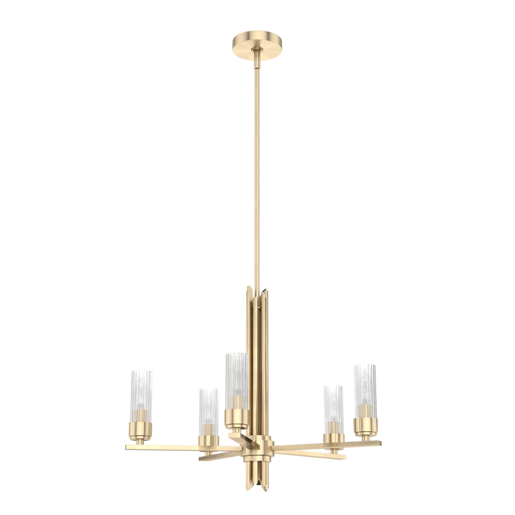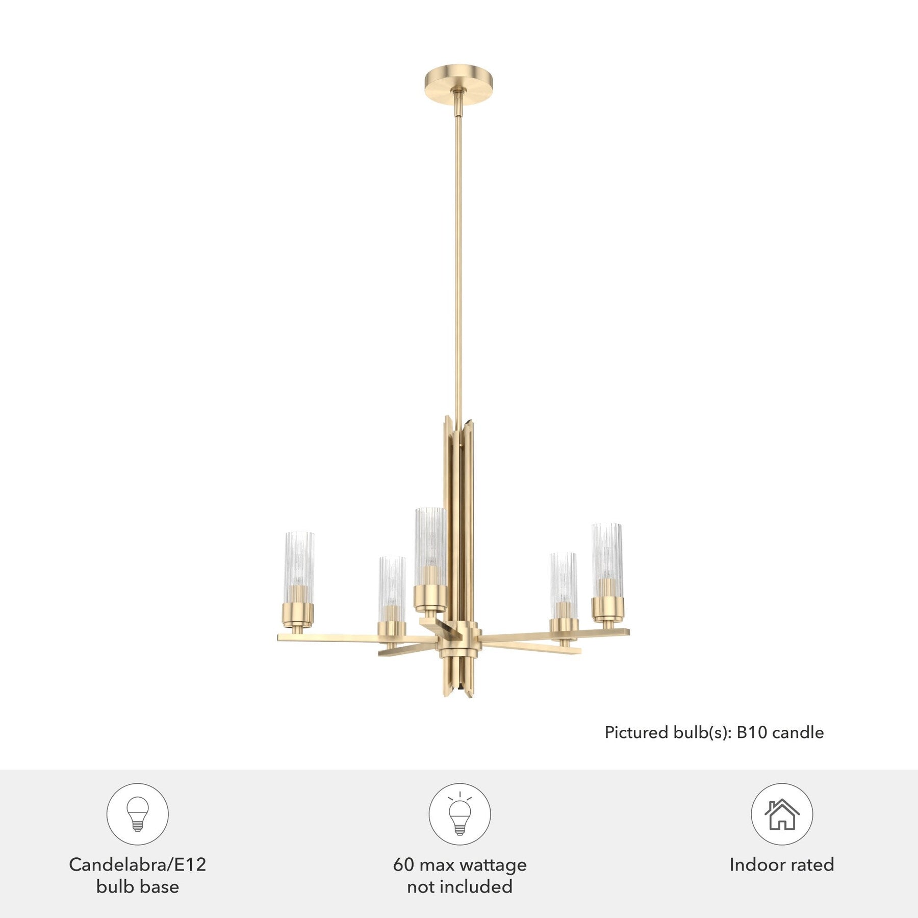 Illuminate your space with the Hunter Gatz, a striking 5-light LED chandelier. Its satin gold finish and ribbed glass shades create a luxurious ambiance ideal for contemporary settings. This durable, easy-to-install chandelier is perfect for adding elegance to kitchens, dining rooms, and living areas.