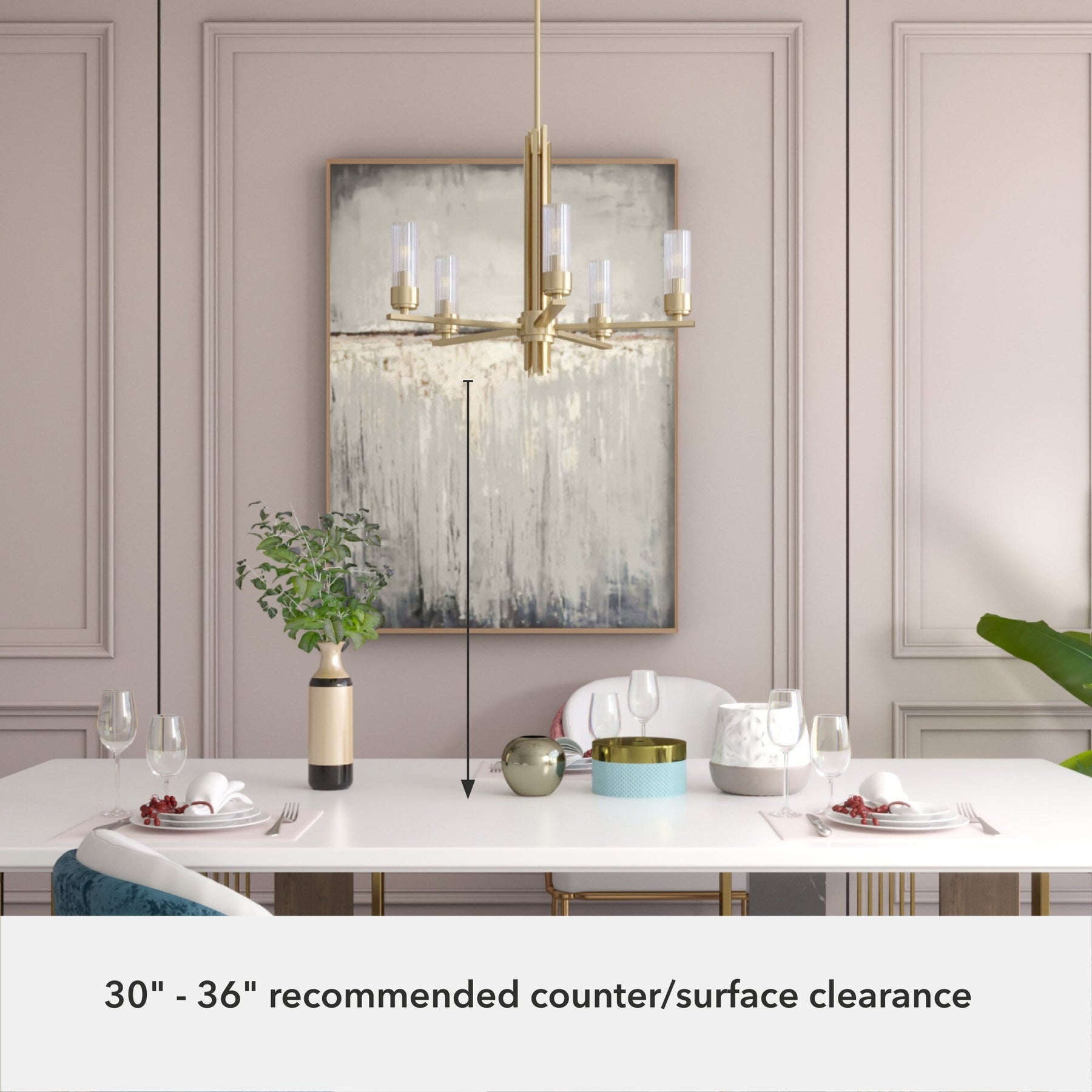A: The Hunter Gatz chandelier comes with one 6-inch and four 12-inch downrods, allowing you to customize the hanging height from 30.75 inches to 78.75 inches to suit your space.