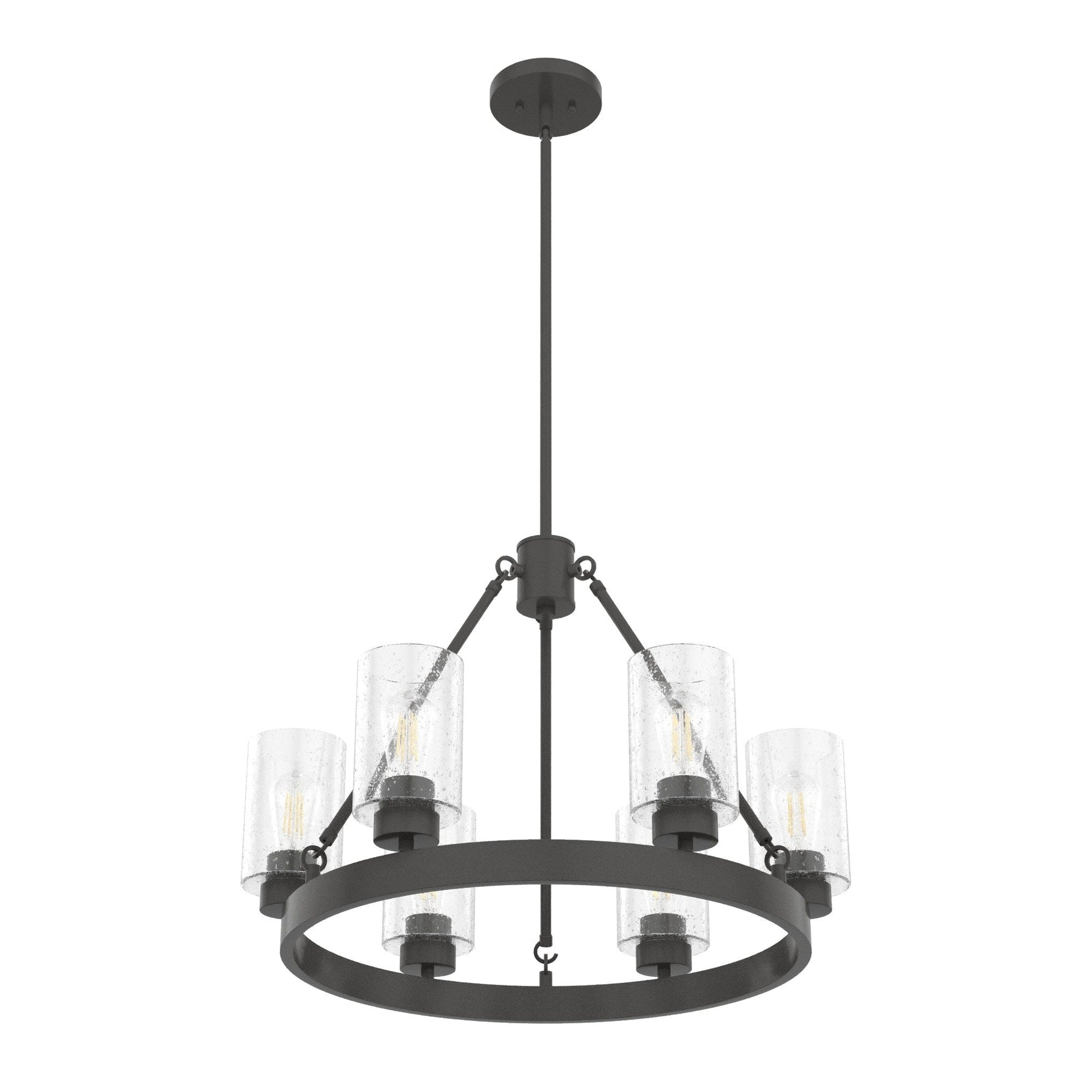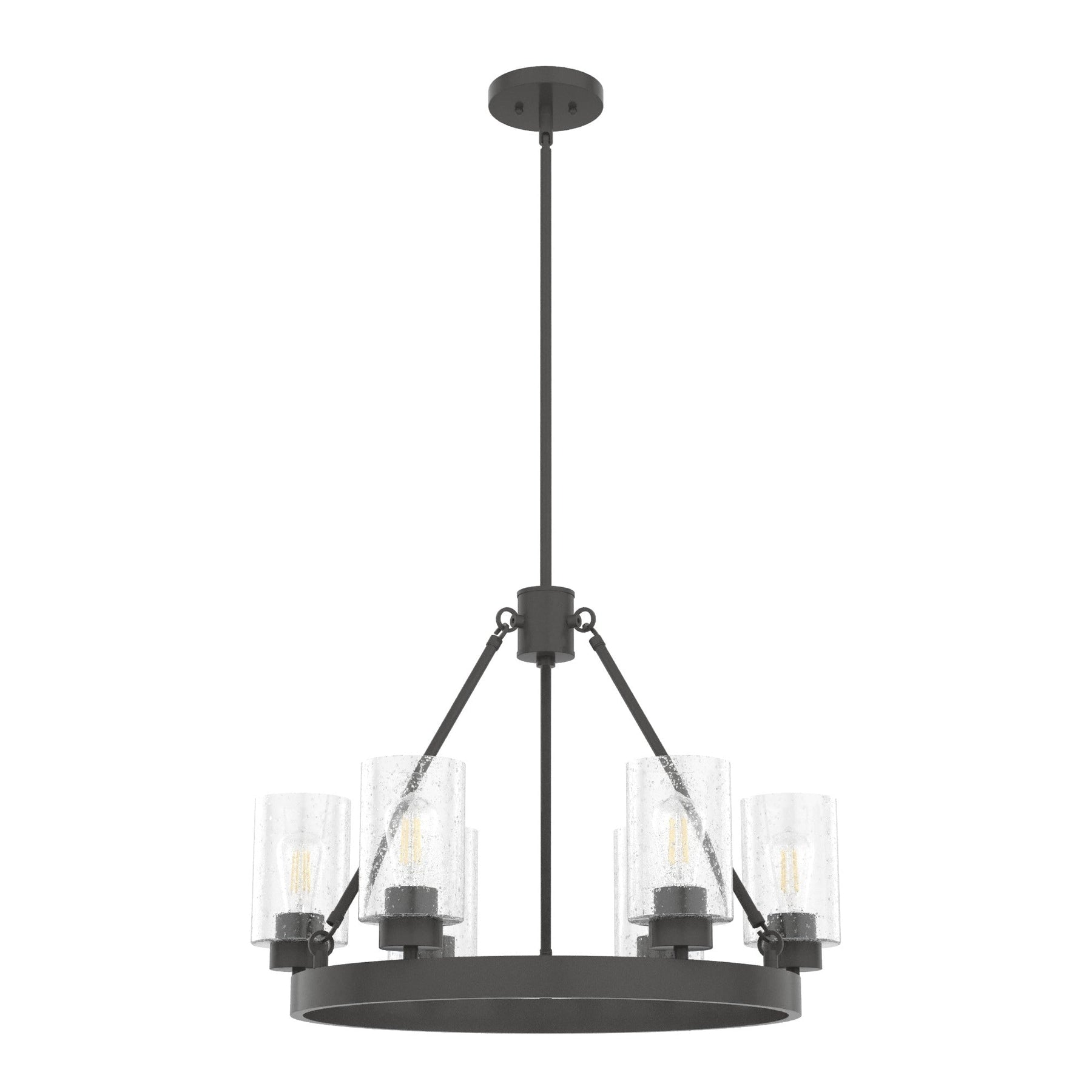 The Hunter Hartland 6-Light Matte Bronze Farmhouse LED Chandelier combines classic design with modern efficiency. Featuring a noble bronze finish and charming seeded glass shades, it elegantly illuminates your space—ideal for kitchens, dining rooms, and living areas.