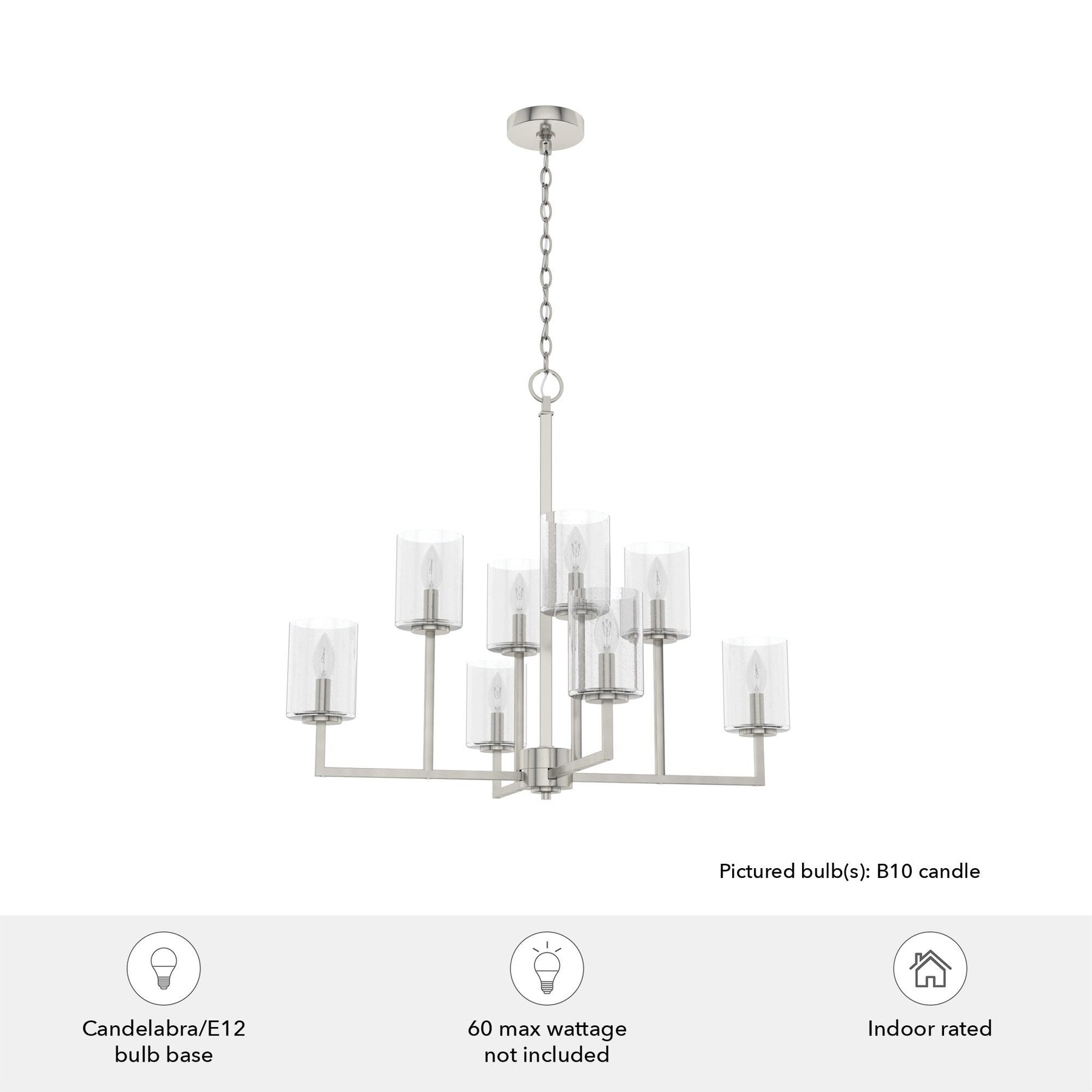 Elevate any room with the Kerrison 8-Light Brushed Nickel Chandelier from Hunter. This transitional fixture combines sleek geometric lines with premium seeded glass for a refined touch. Perfect for kitchens, dining rooms, or foyers, it offers flexible hanging options and compatibility with LED bulbs for modern convenience.