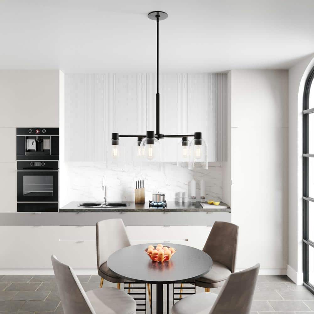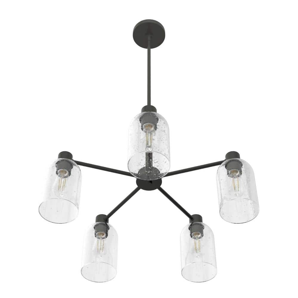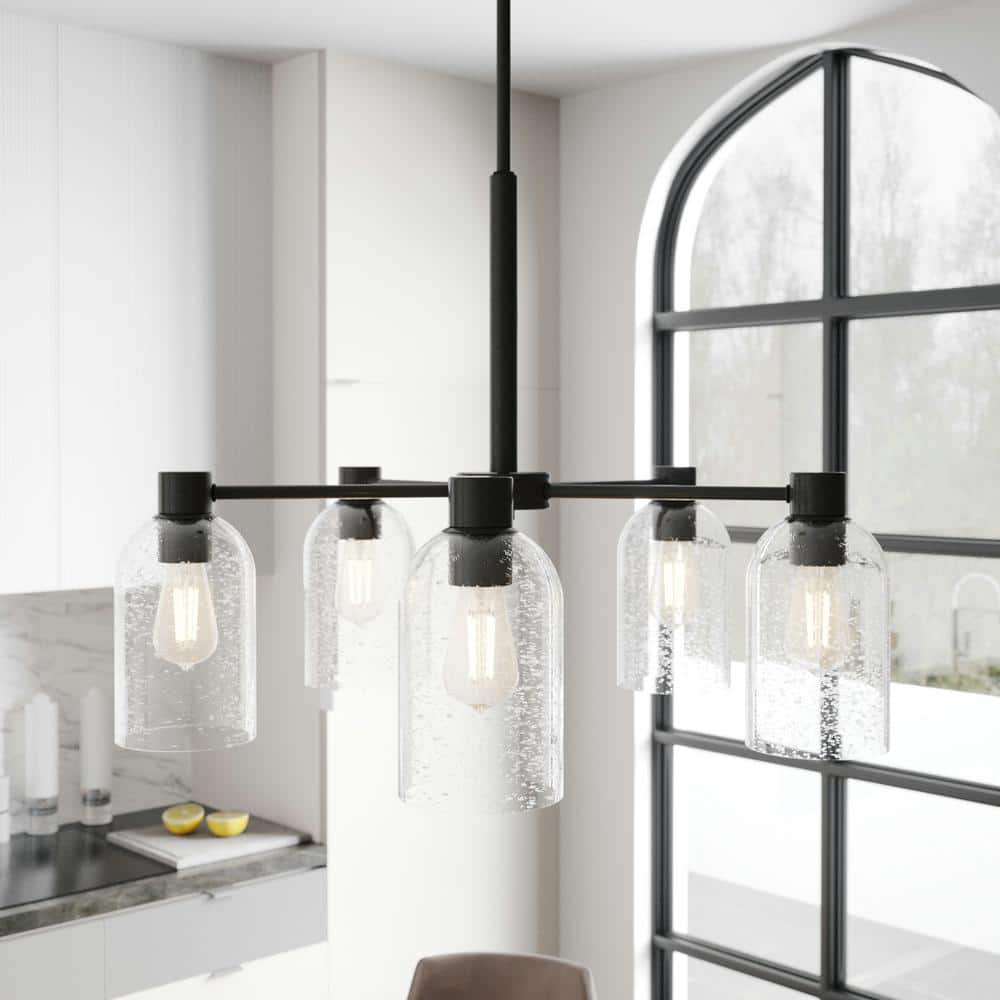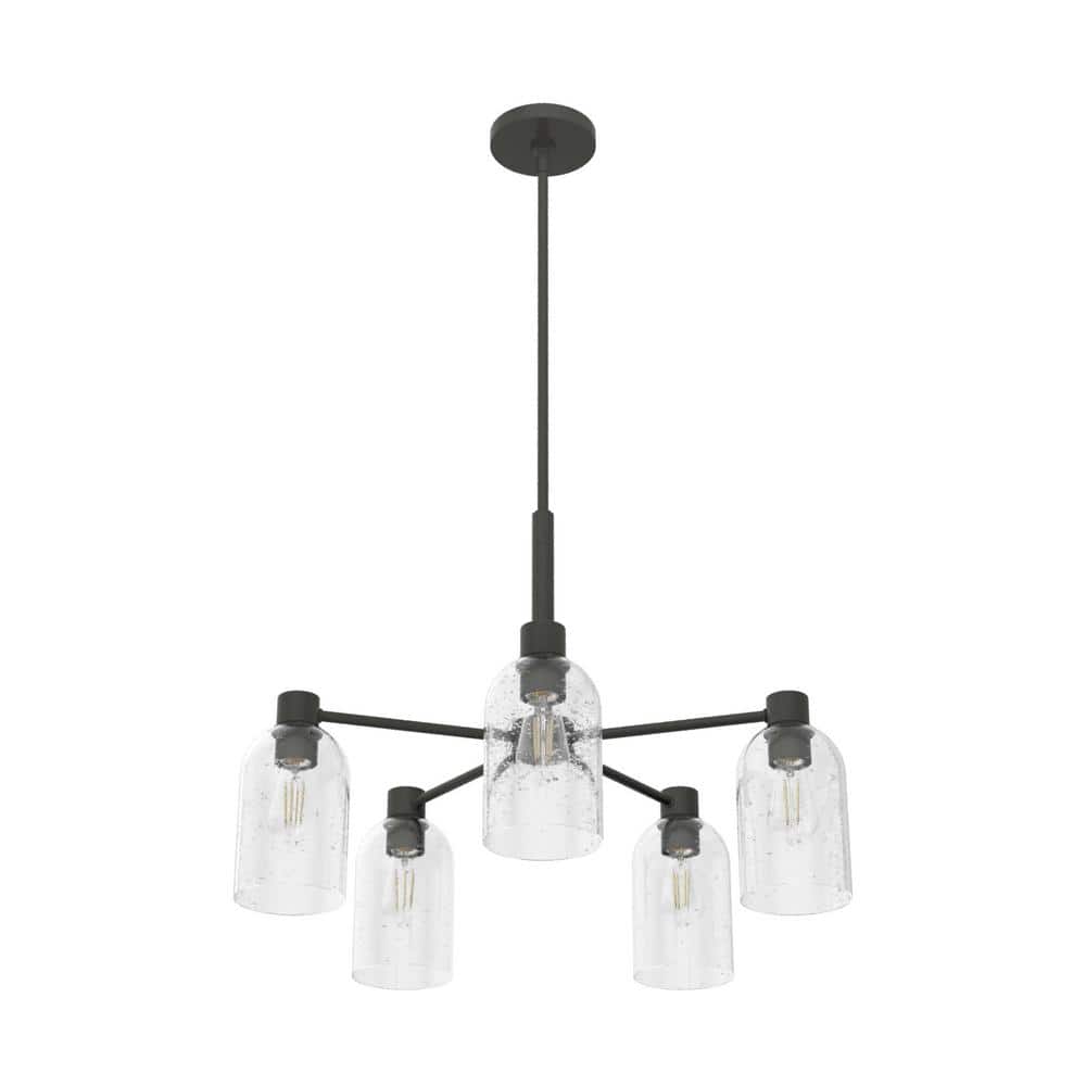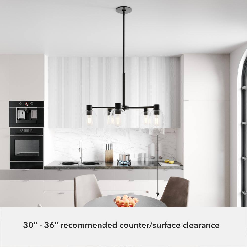 The Hunter Lochmeade 5-Light Chandelier blends timeless elegance with modern aesthetics, featuring noble bronze and seeded glass shades that illuminate your kitchen or dining area with a warm, inviting glow. Built for durability, its minimalist design and flexible hanging options make it an excellent addition to any contemporary space.