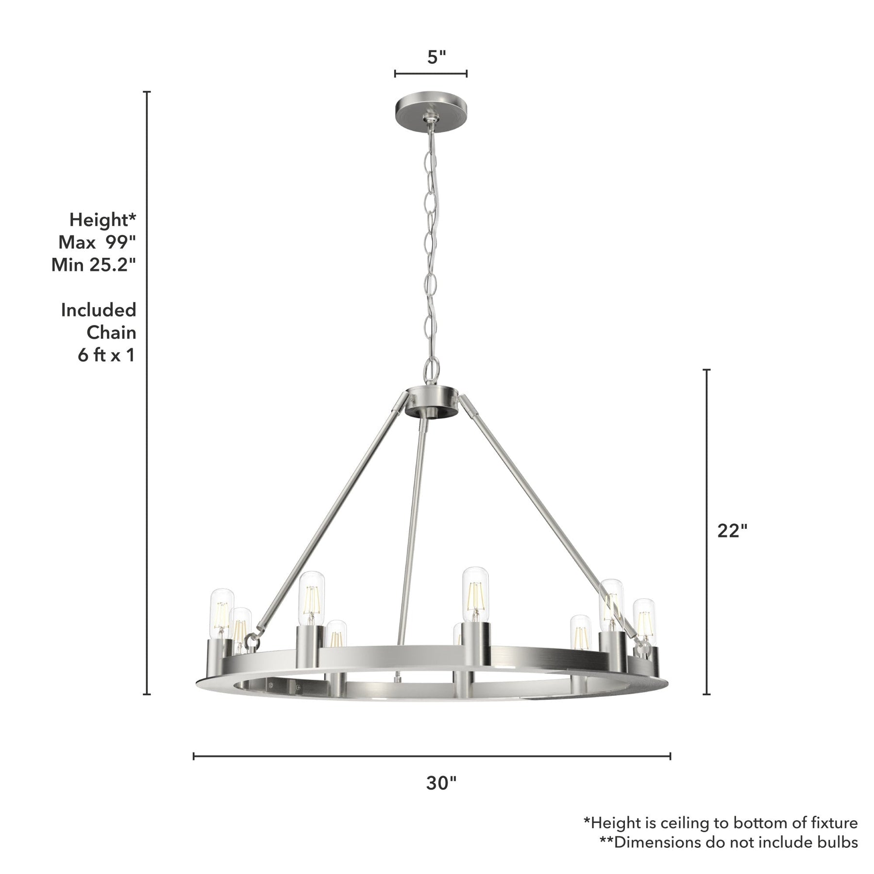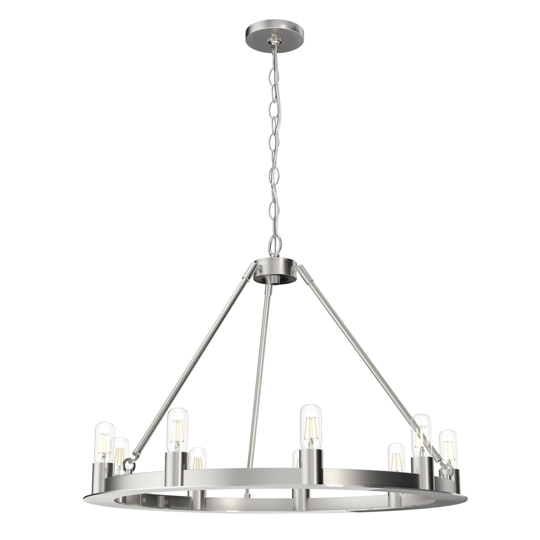 Transform any grand room into a haven of style with the Saddlewood Chandelier, a masterpiece that balances industrial functionality with farmhouse simplicity. Its brushed nickel finish complements a variety of decor themes, while its striking bare bulb design invites creativity in bulb choice to suit your mood and ambiance. Imagine this chandelier as the centerpiece in a sophisticated dining area or airy kitchen, casting a chic and inviting glow. It is an essential touch for those who desire luxury and warmth harmoniously intertwined in their living spaces.