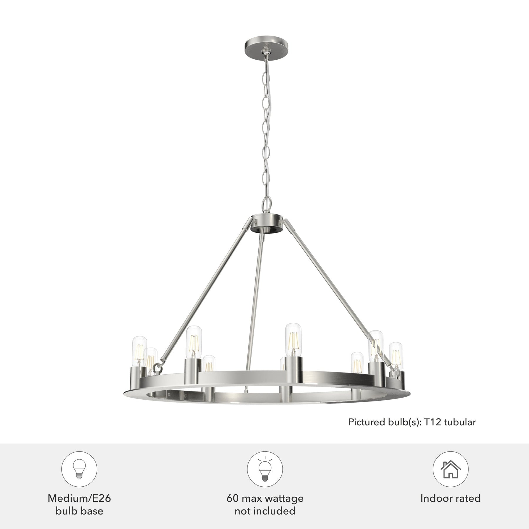Illuminate your space with the Hunter Saddlewood 9-Light Brushed Nickel Chandelier, a versatile piece combining modern industrial style with farmhouse charm. With its simple, bare bulb design and robust brushed nickel finish, this chandelier offers elegance and ample lighting for large areas like kitchens and dining rooms. Experience durability and a customizable ambiance in your home lighting setup.