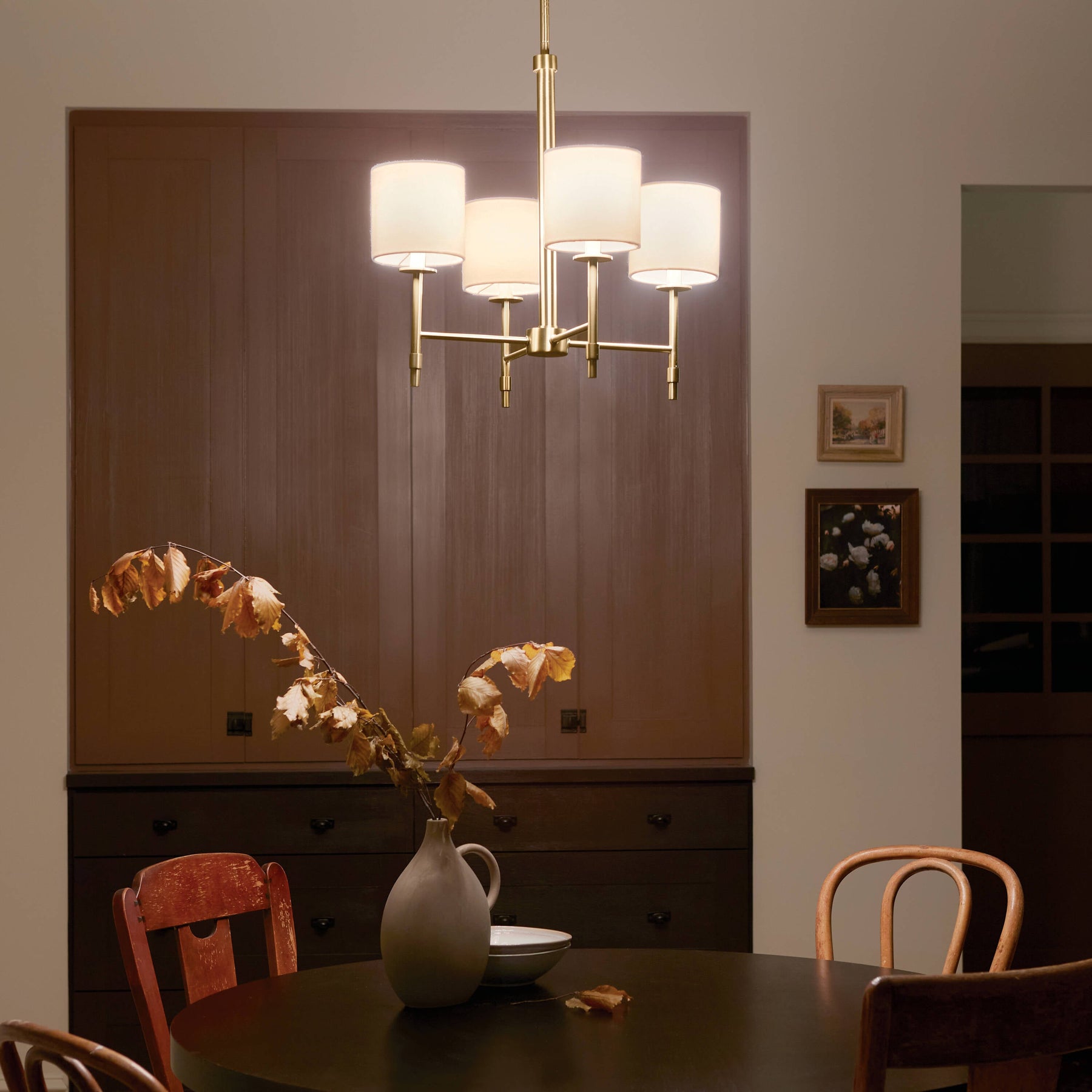 Illuminate your space with the Kichler Ali 4-Light Brushed Brass Chandelier, a perfect blend of classic elegance and contemporary style. Featuring a sturdy steel frame and fabric shades, this chandelier offers durable performance and a refined look.