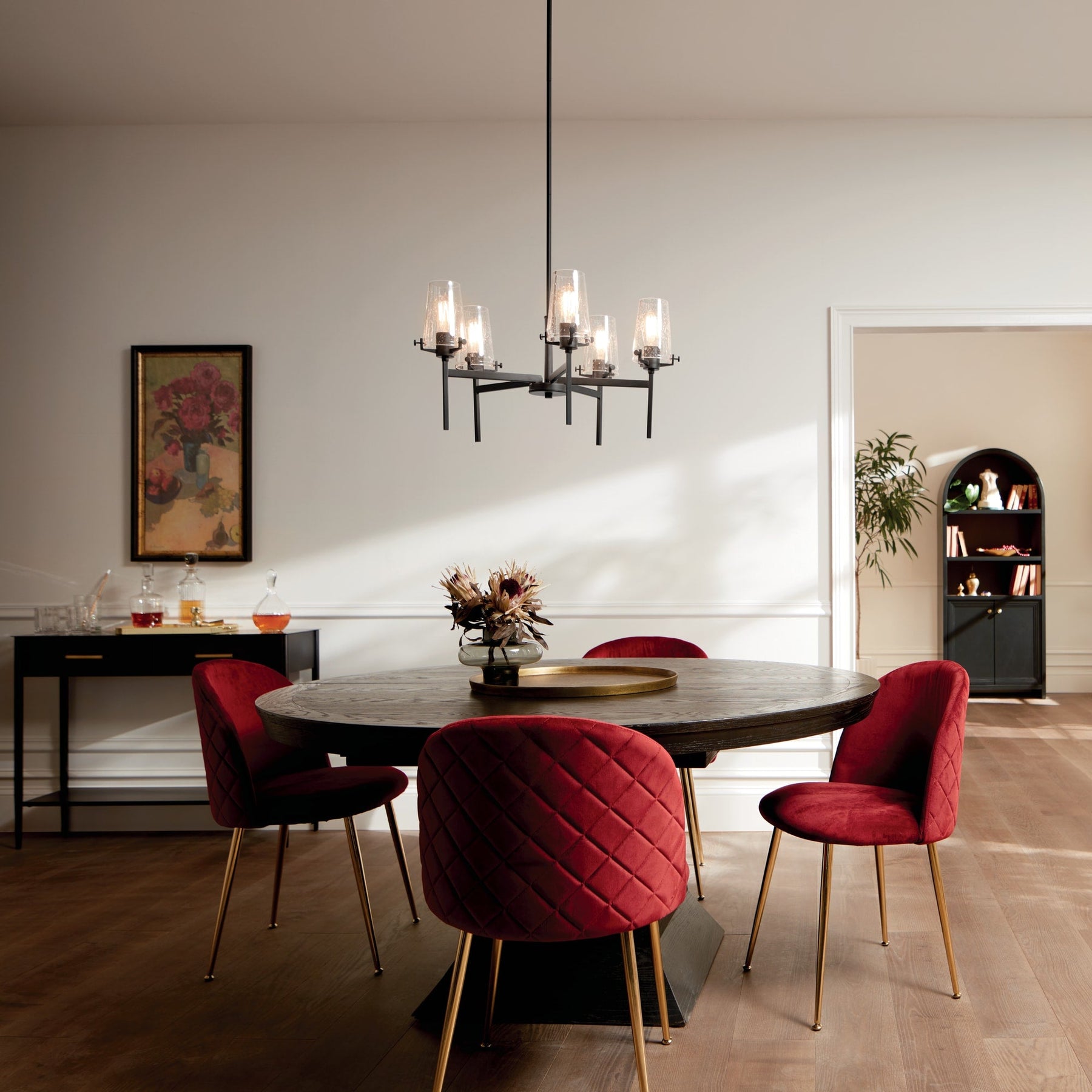 Elevate your living space with the Kichler Alton Chandelier, a masterpiece of industrial elegance that radiates sophistication. The striking blend of black metal and clear seeded glass gives each bulb a magical glow, reminiscent of vintage charm with a modern twist. Imagine this luminous centerpiece above your rustic dining table, paired with weathered woods and plush textures. It’s not just a light fixture—it’s a statement of timeless style, embodying the essence of sophisticated living.