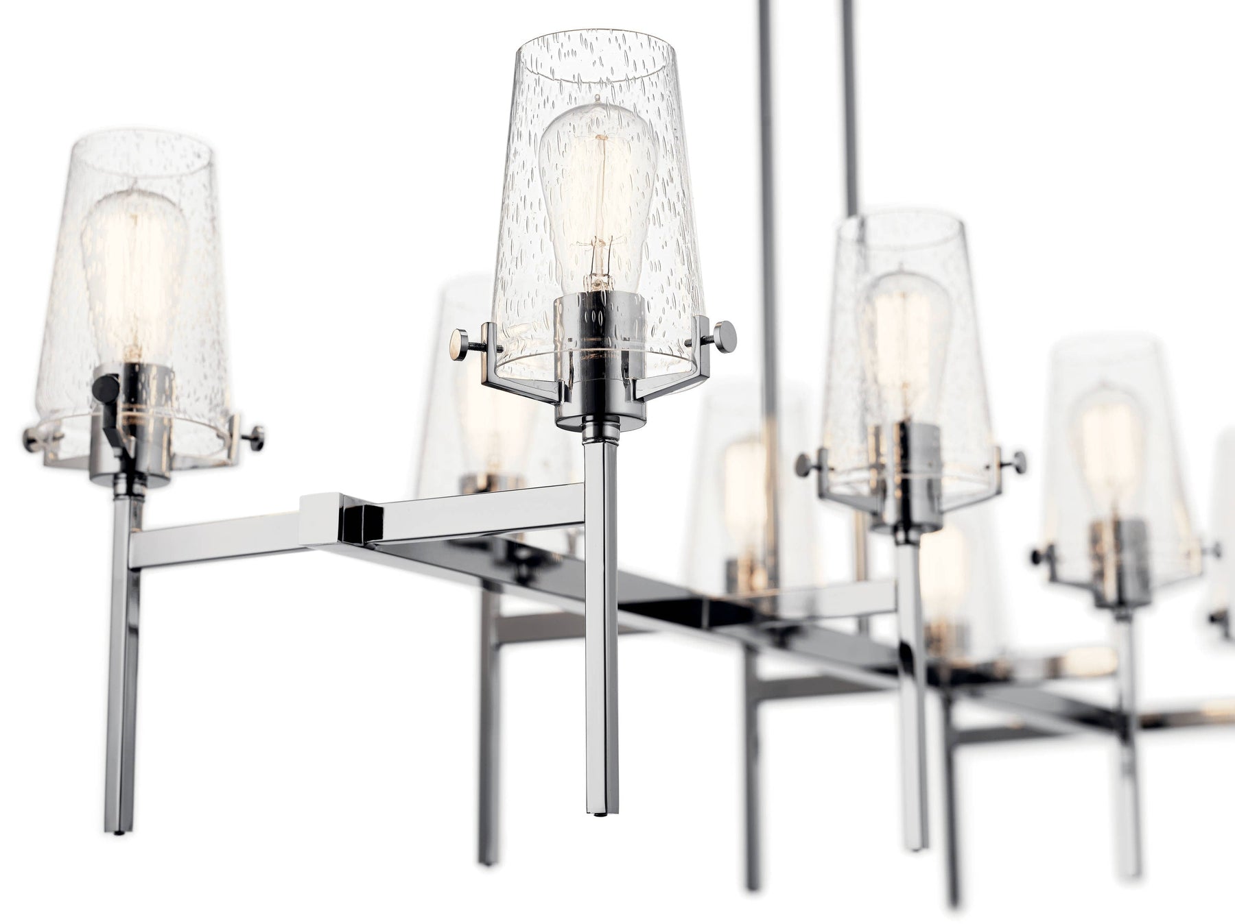 Illuminate your space with the Kichler Alton 8-Light Chrome Vintage Chandelier, expertly blending industrial-era details with a sleek modern aesthetic. This stylish fixture features clear seeded glass shades that add a touch of sophistication, making it perfect for any dining room, kitchen, or living area.
