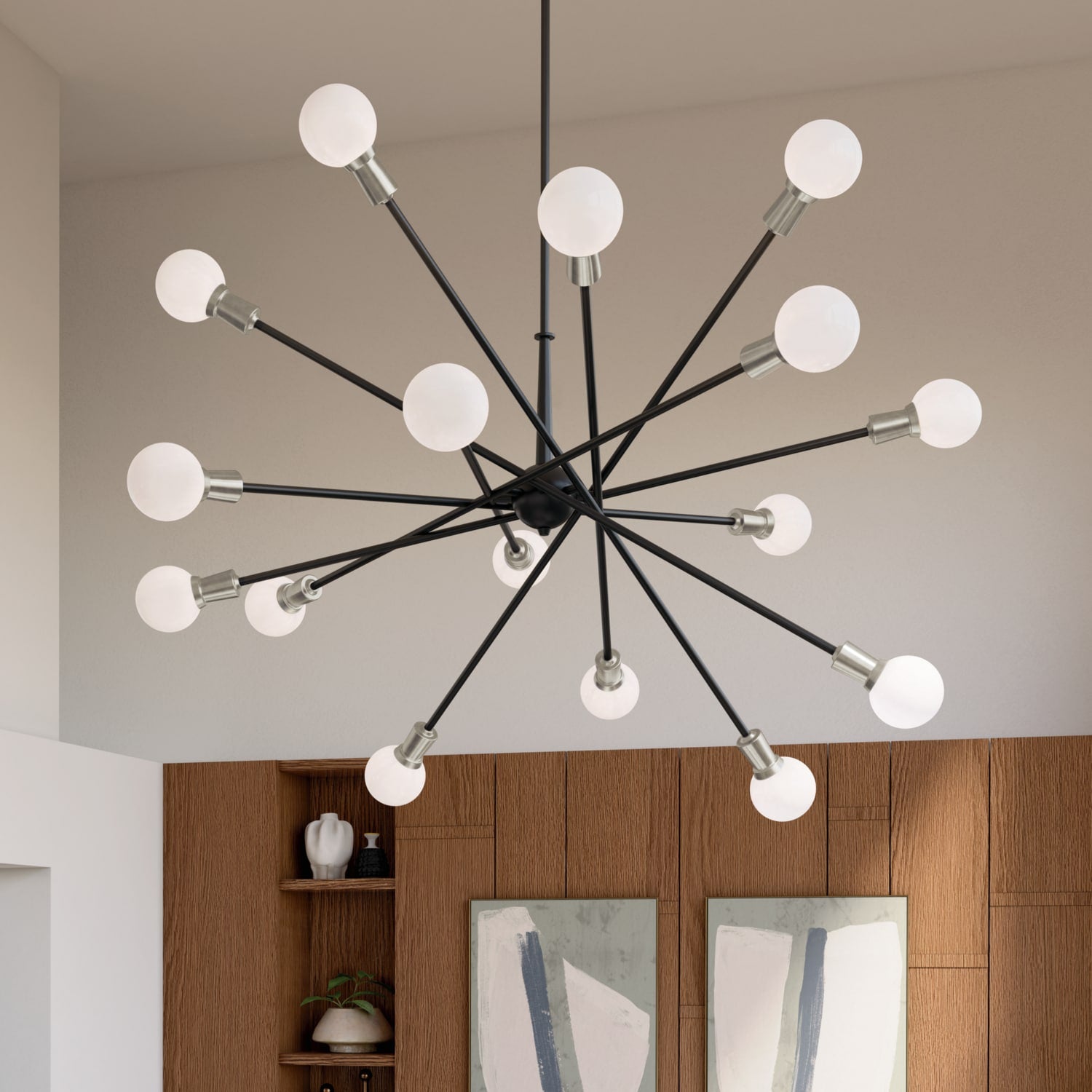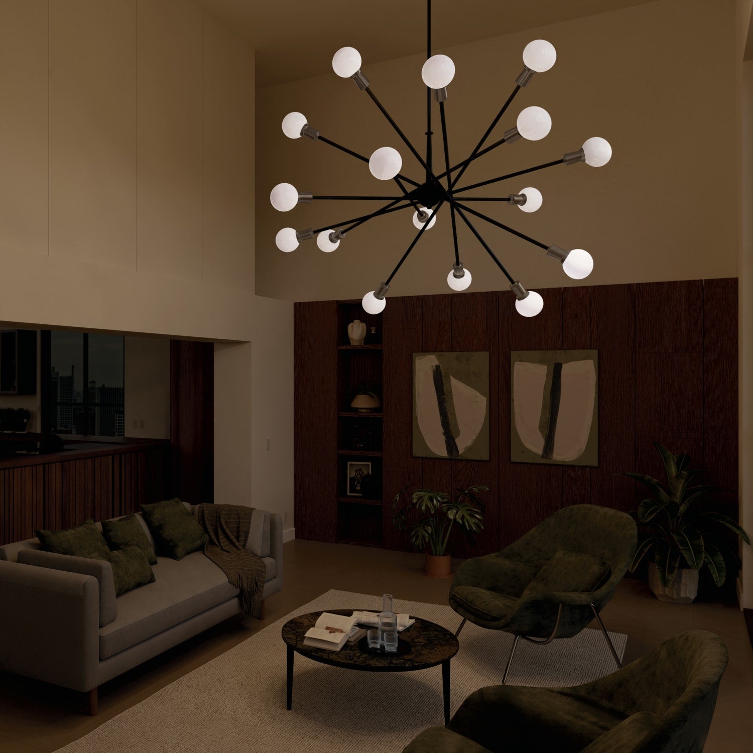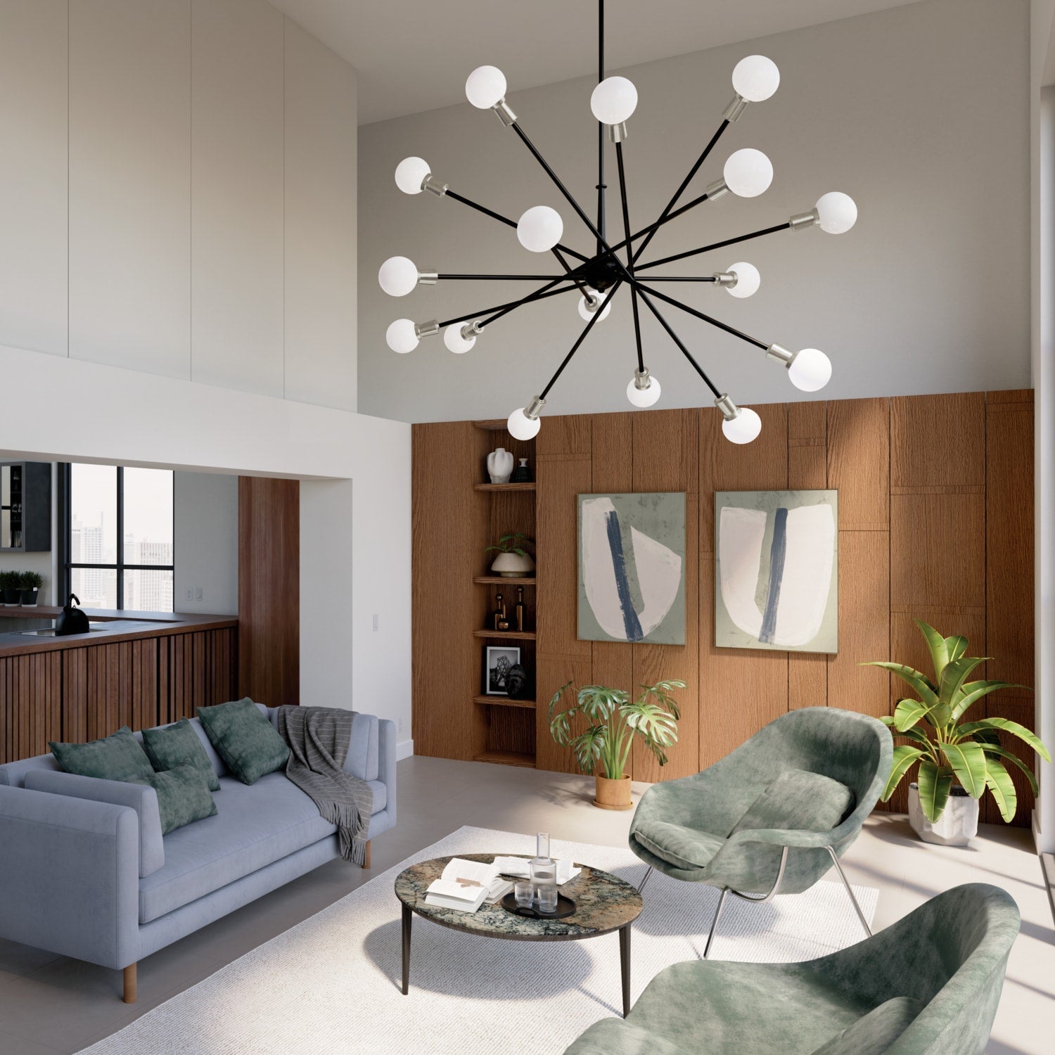 The Kichler Armstrong 16-Light Black Chandelier brings bold elegance to any room with its striking, sputnik-inspired design. Crafted in a modern black finish, this chandelier is perfect for both residential and hospitality settings, providing a sophisticated focal point that embodies mid-century modern allure. Its versatility and scalable size make it ideal for grand spaces.