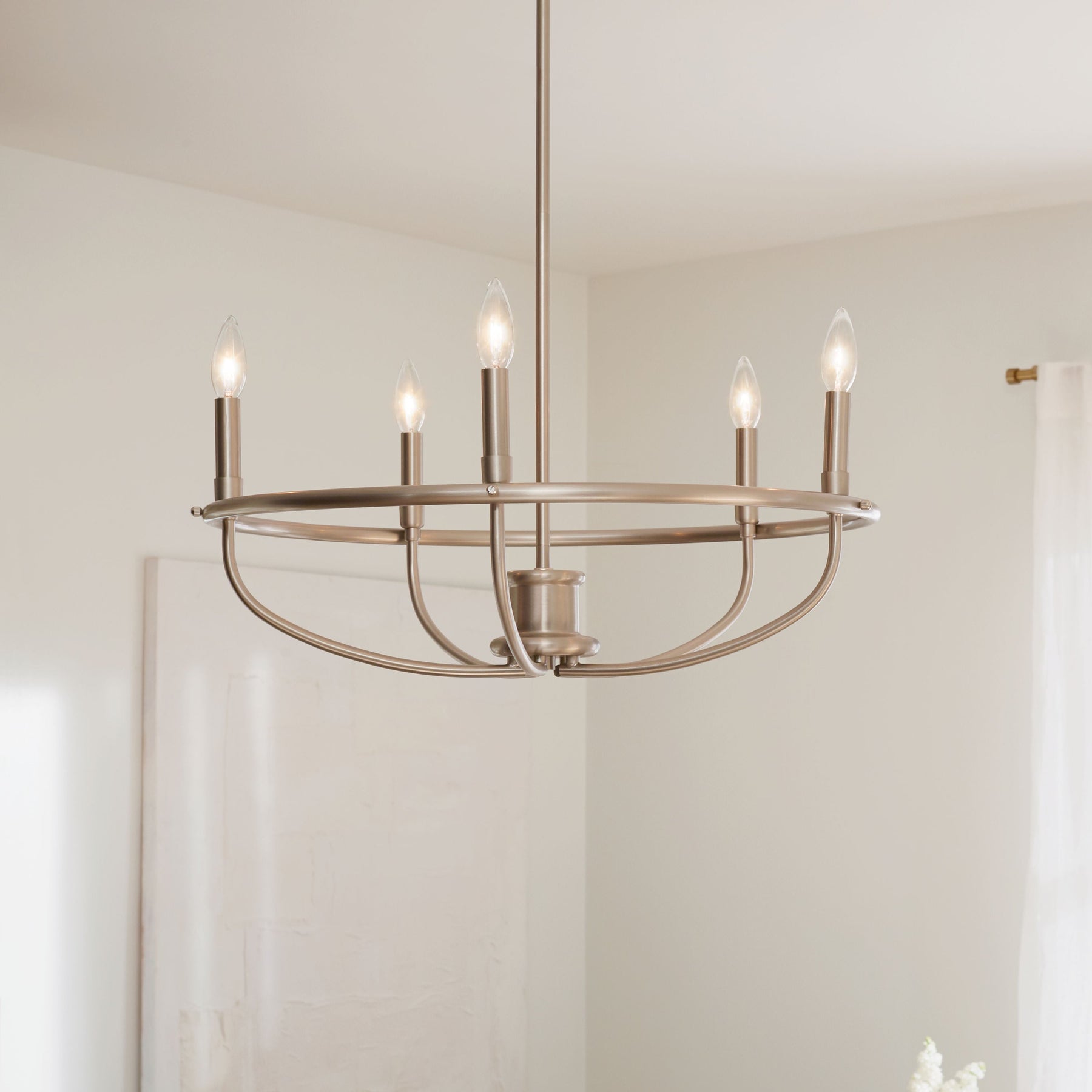 Illuminate your space with the Kichler Bethel 5-Light Brushed Nickel Chandelier, blending contemporary elegance with effortless style. Its basket-inspired design and brushed nickel finish add a touch of sophistication, creating a stunning aesthetic perfect for dining rooms, living rooms, or kitchens. Easy to install, this statement piece complements any modern décor.