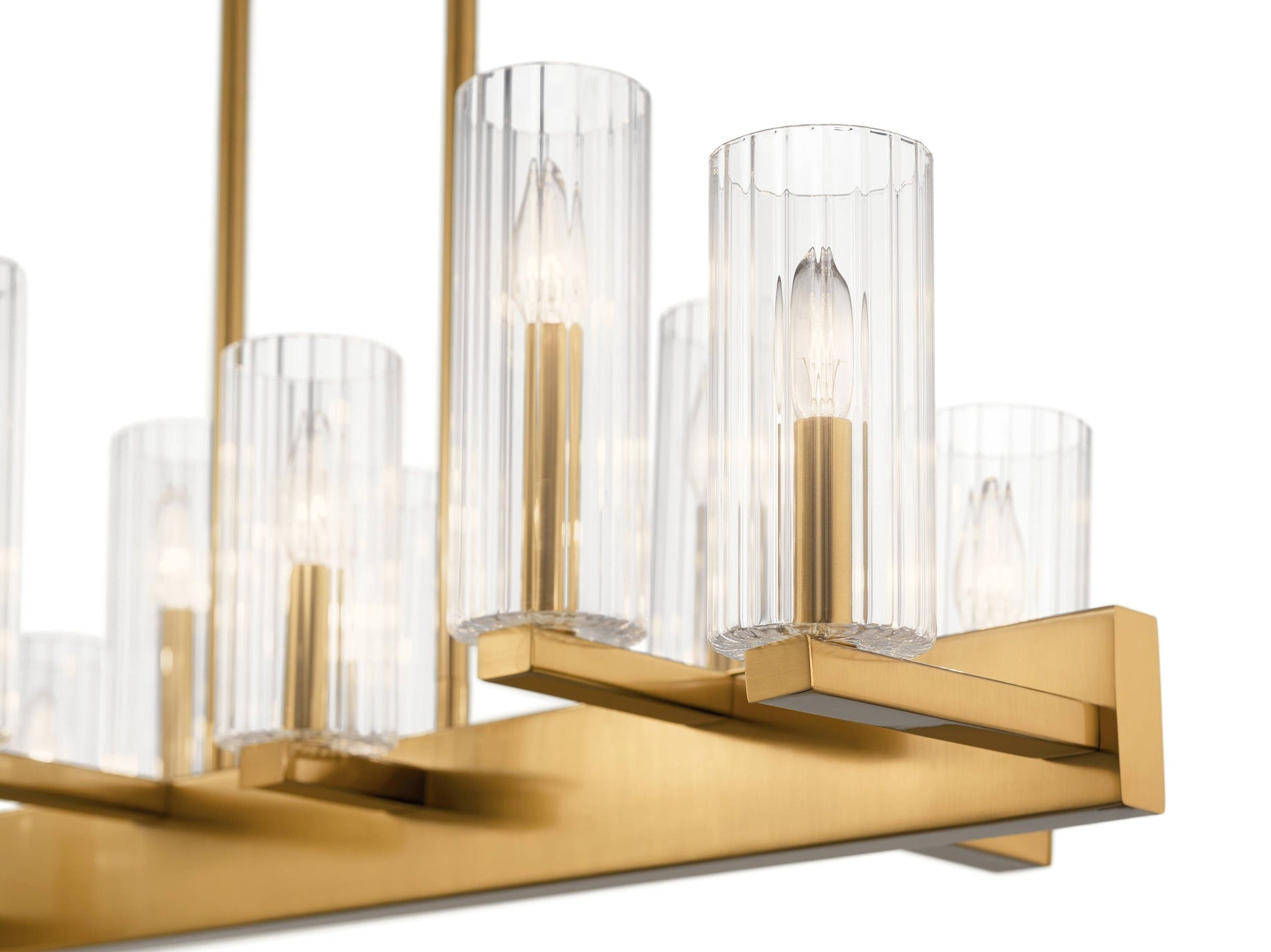 Illuminate your space with the Kichler Cleara 10-Light Gold Chandelier, a sophisticated blend of transitional design and modern flair. Crafted from durable steel and featuring stunning clear ribbed glass shades, this chandelier makes an elegant statement in any room. With its luxurious gold finish and unique linear form, it's the perfect accent to elevate your home decor.
