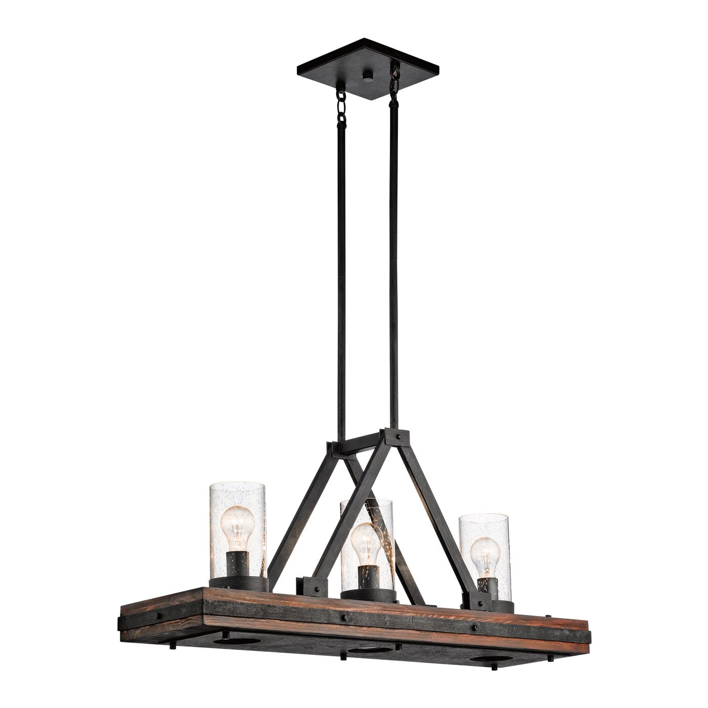 Illuminate your space with the Kichler Colerne 3-Light Farmhouse Chandelier, a masterful blend of rustic charm and industrial sophistication. Featuring a stunning auburn-stained wood frame with distressed black metal accents and clear seeded glass shades, this fixture is designed to make a bold statement in any room.